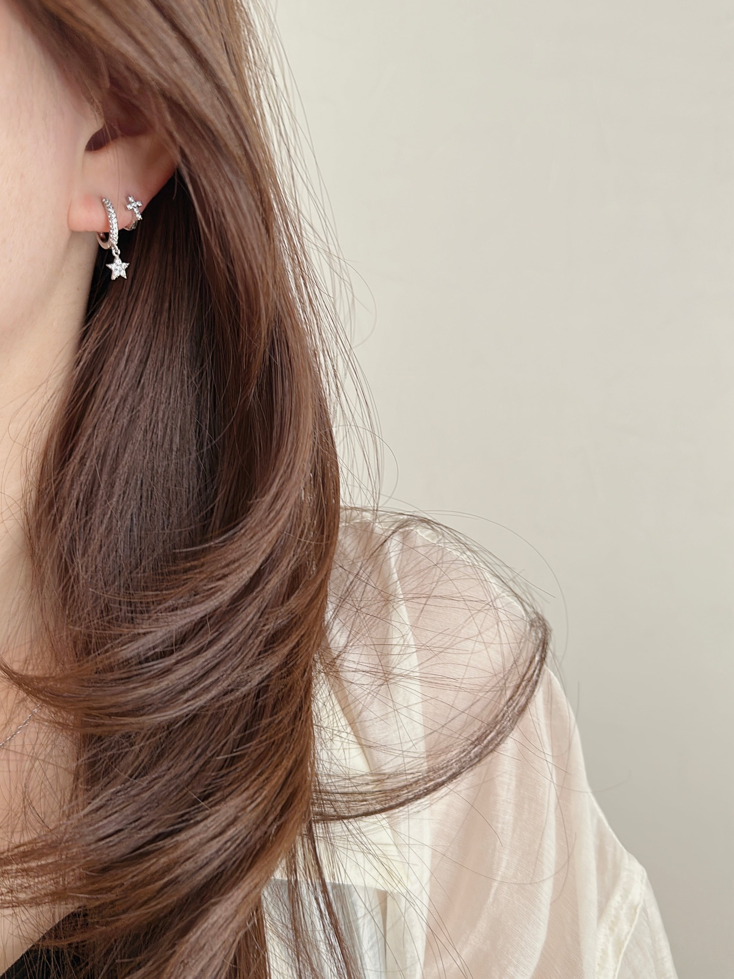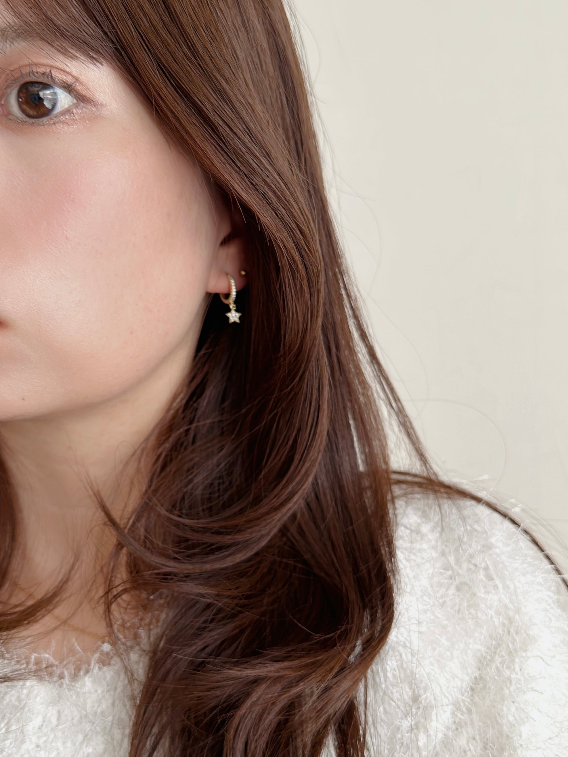 小さな星モチーフが耳元でさりげなく揺れ、動くたびに光を反射してきらめく「S925 キラキラスターフープピアス」。