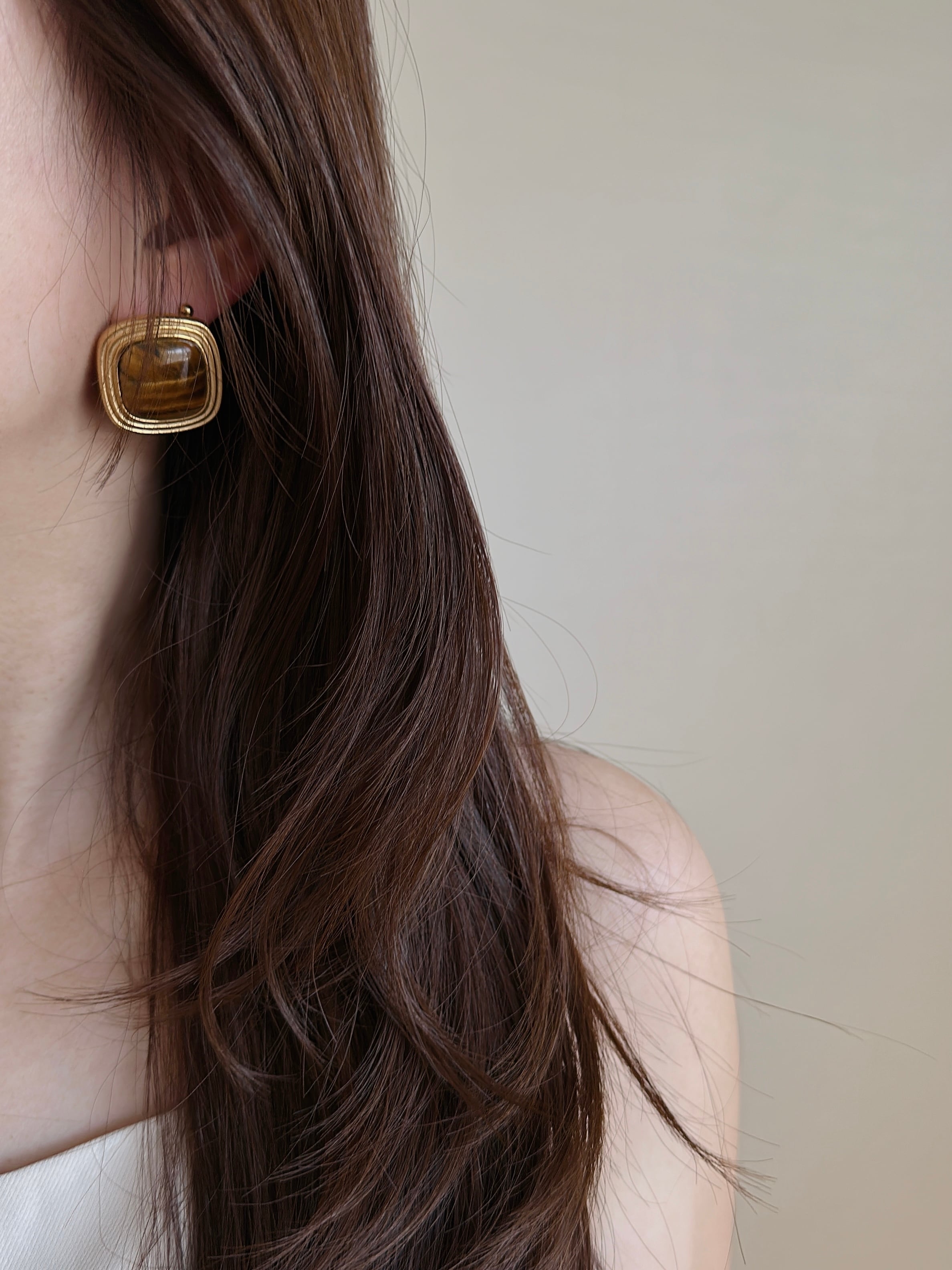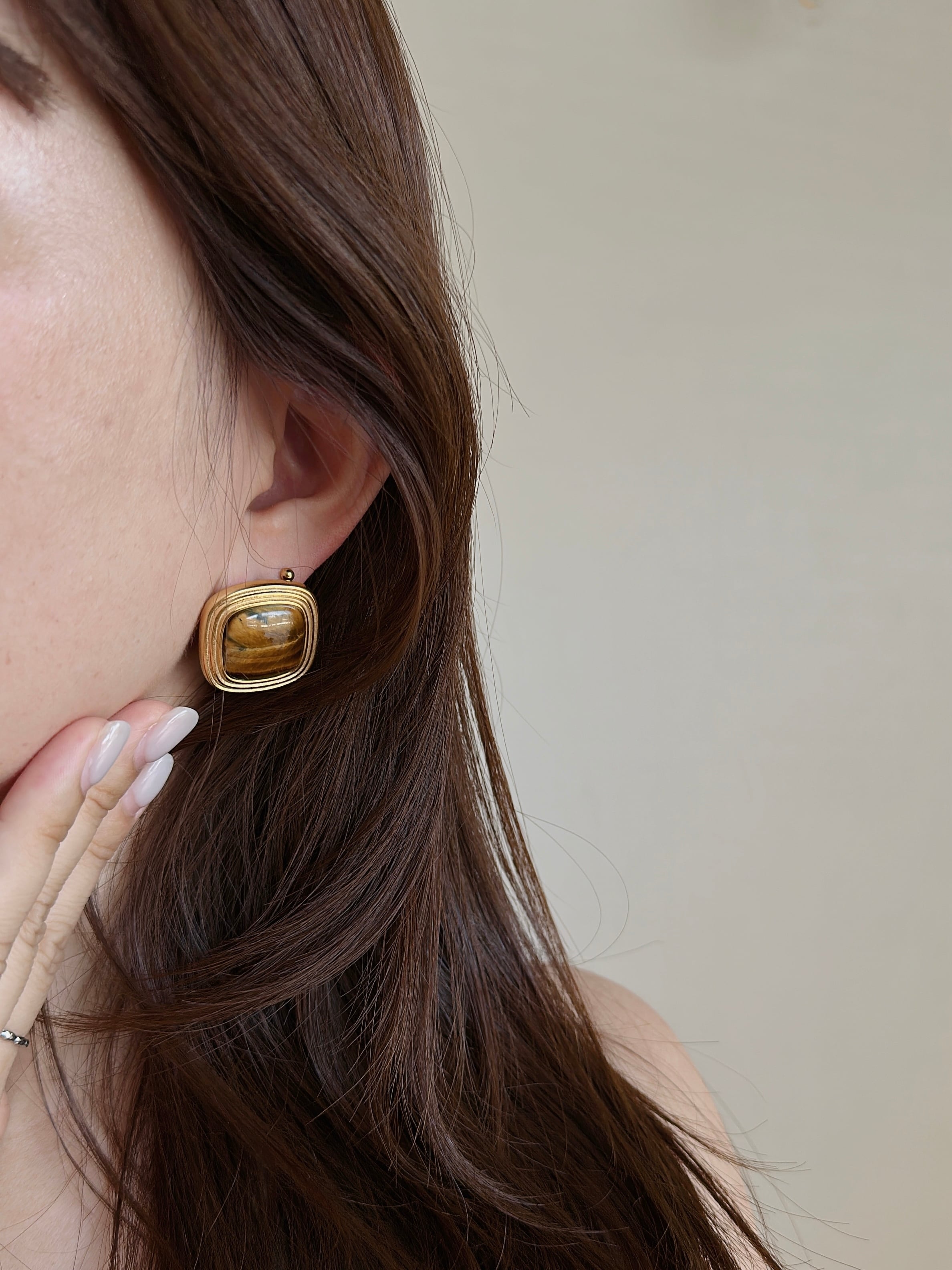クラシカルなスクエアフォルムに、タイガーアイ風の艶やかなストーンをセットした、レトロなムード漂う主役級ピアス。