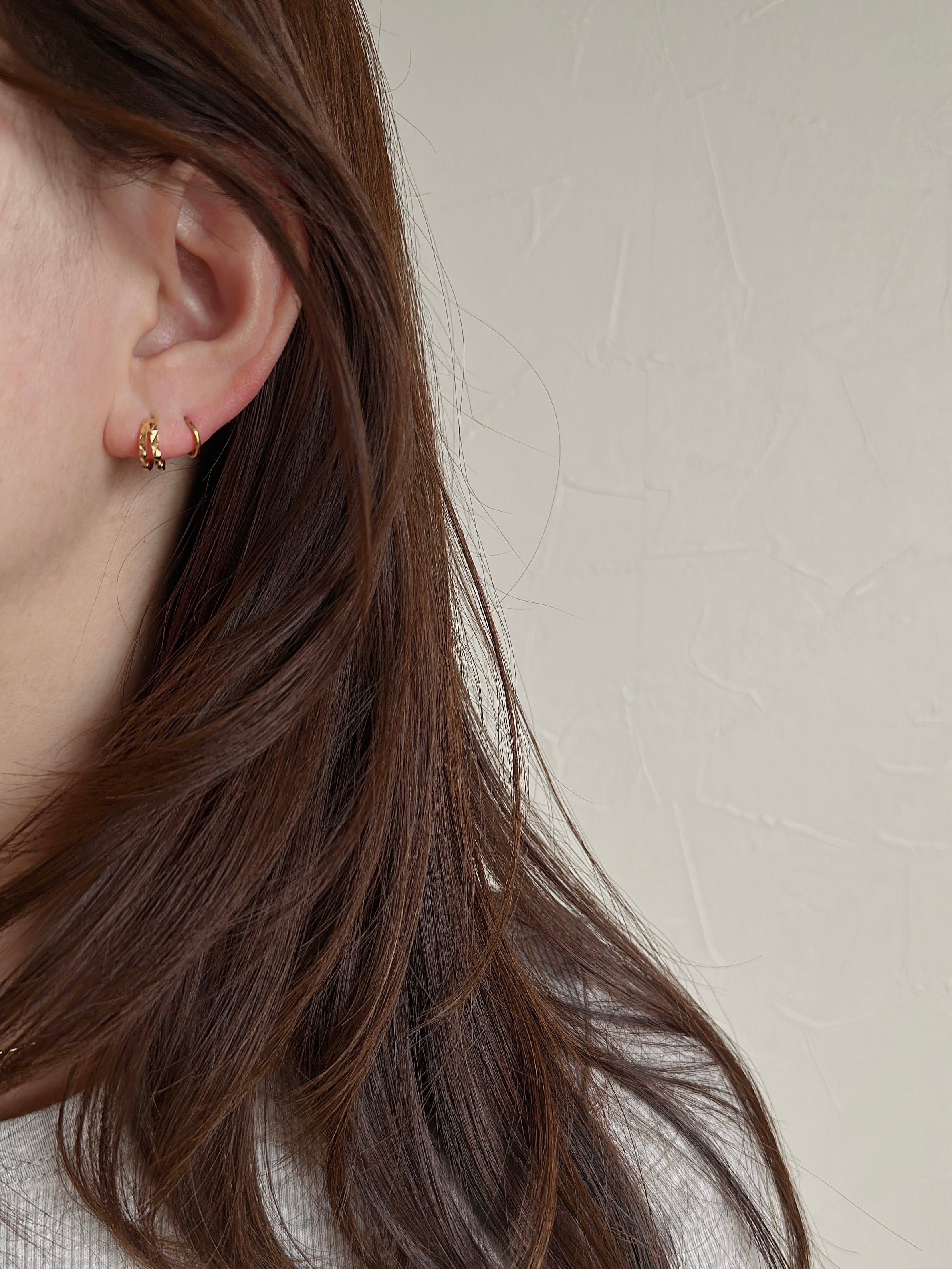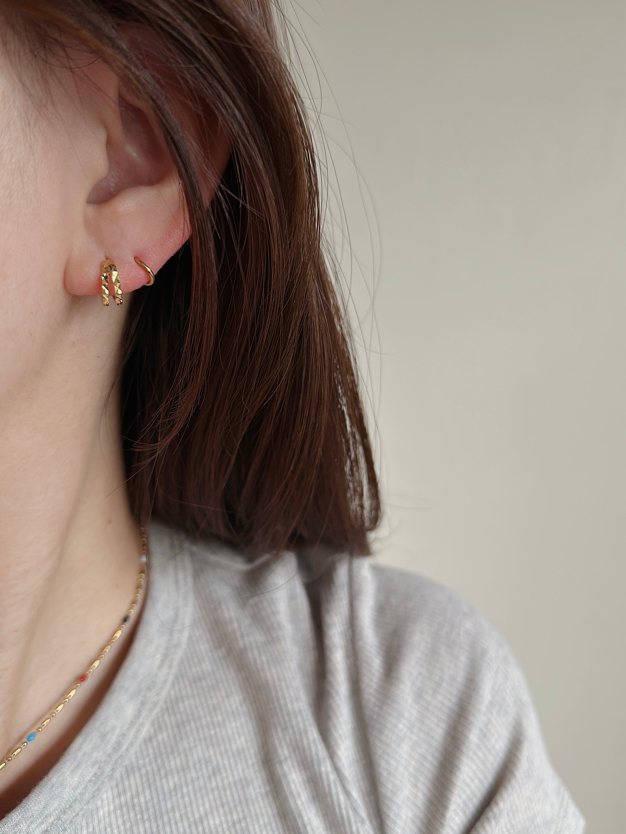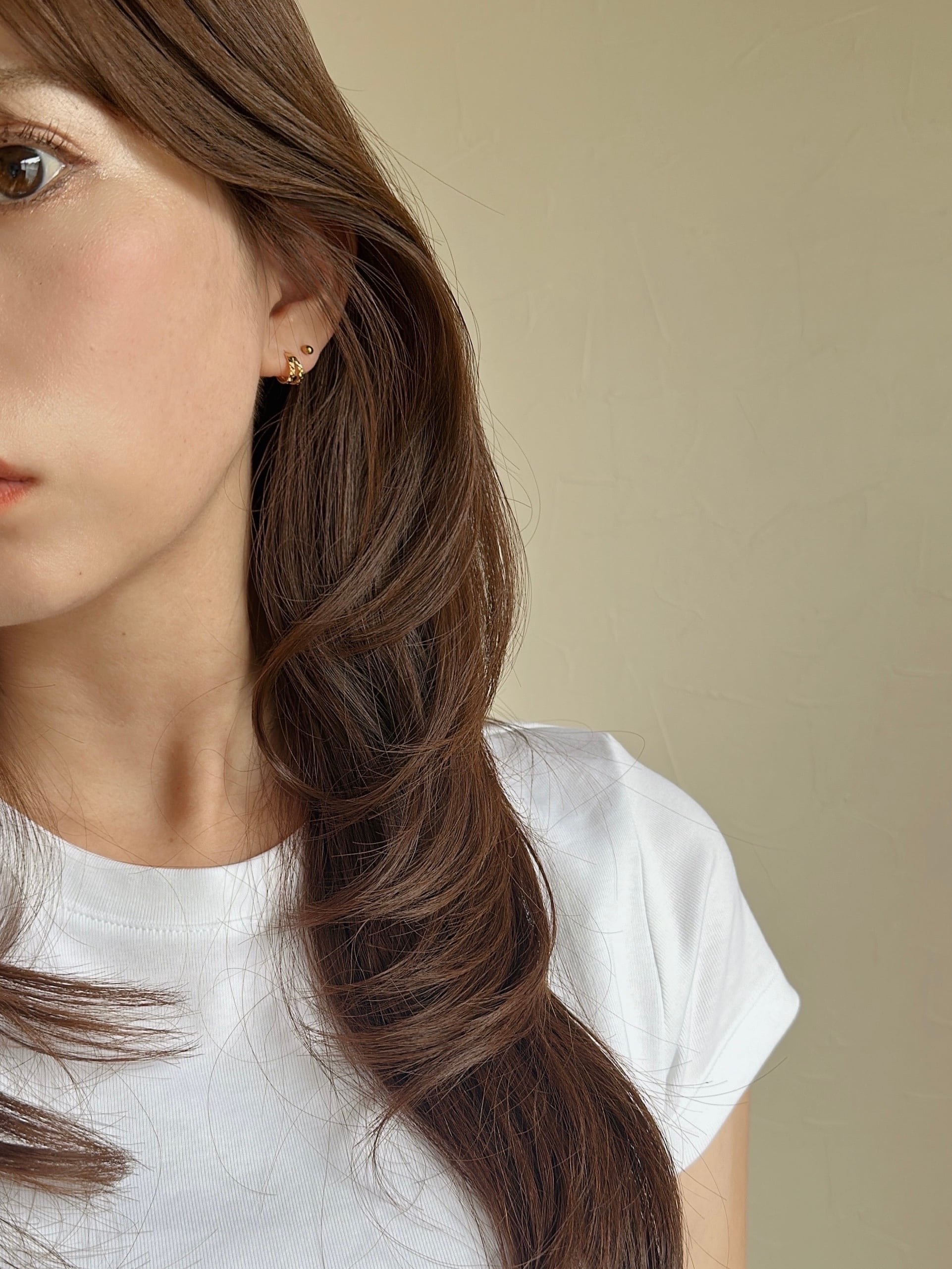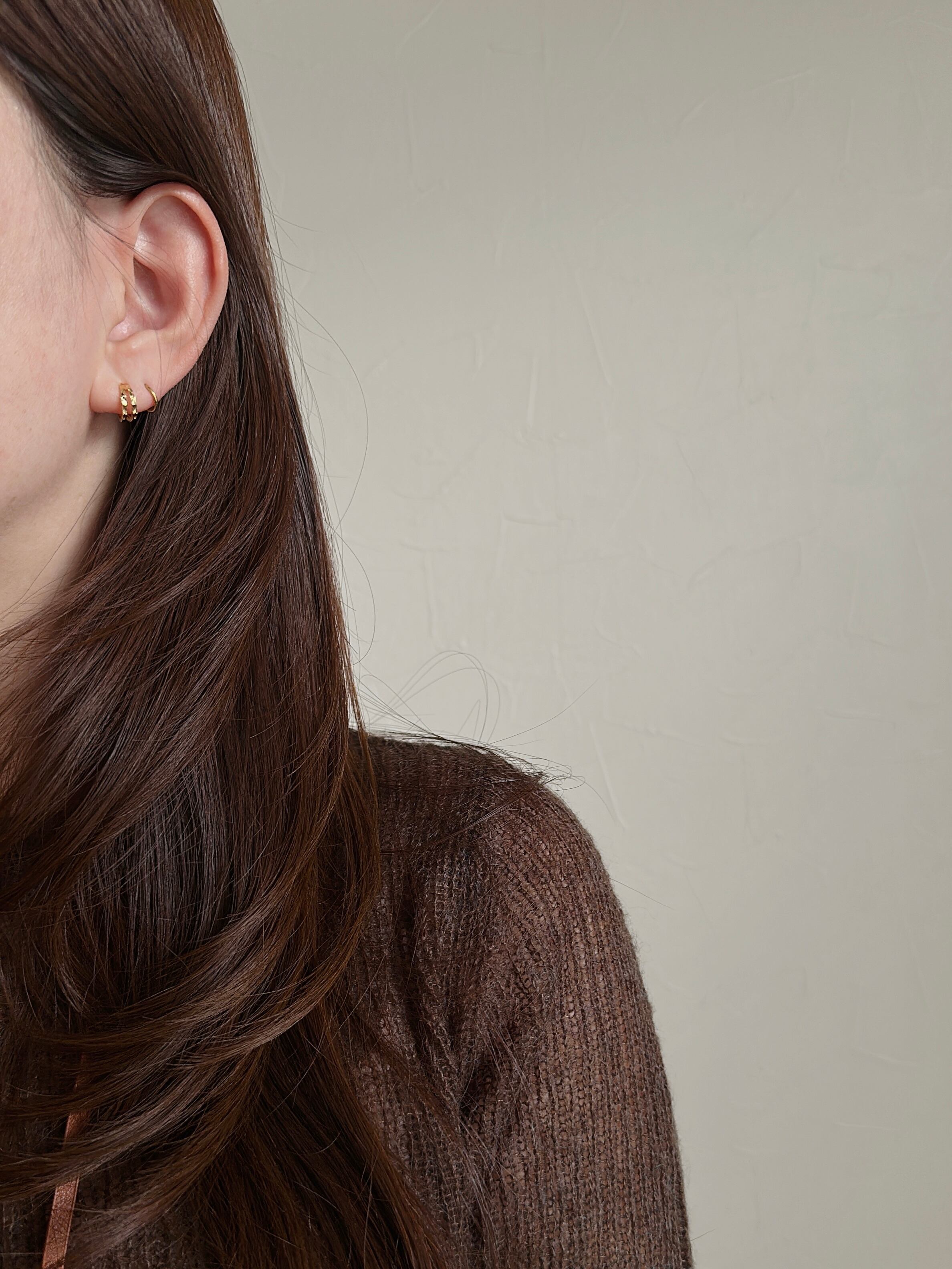 ひとつでつけるのはもちろん、手持ちの小さめピアスやイヤーカフとのレイヤードもおすすめ。