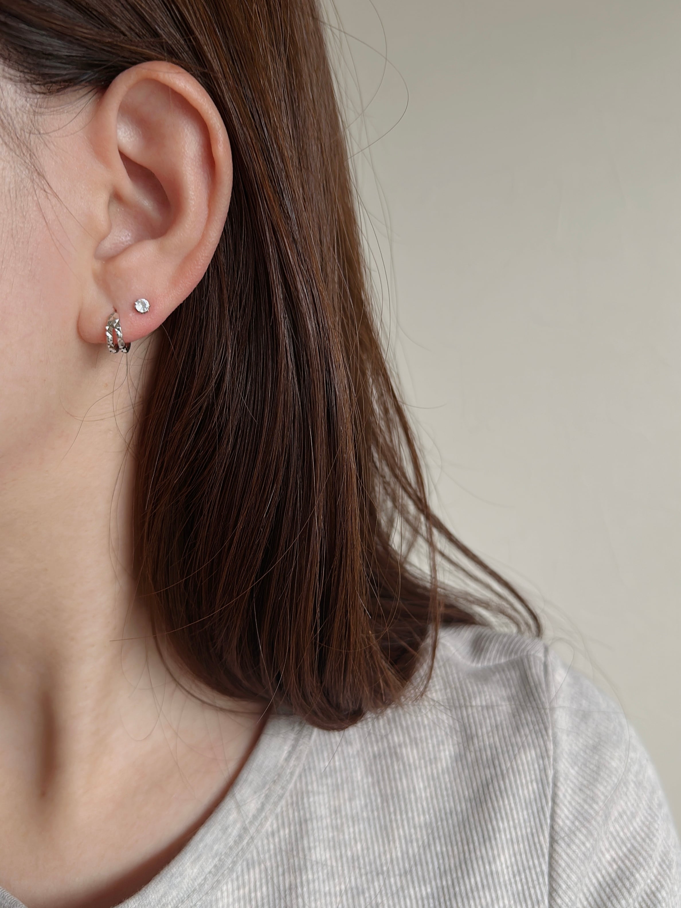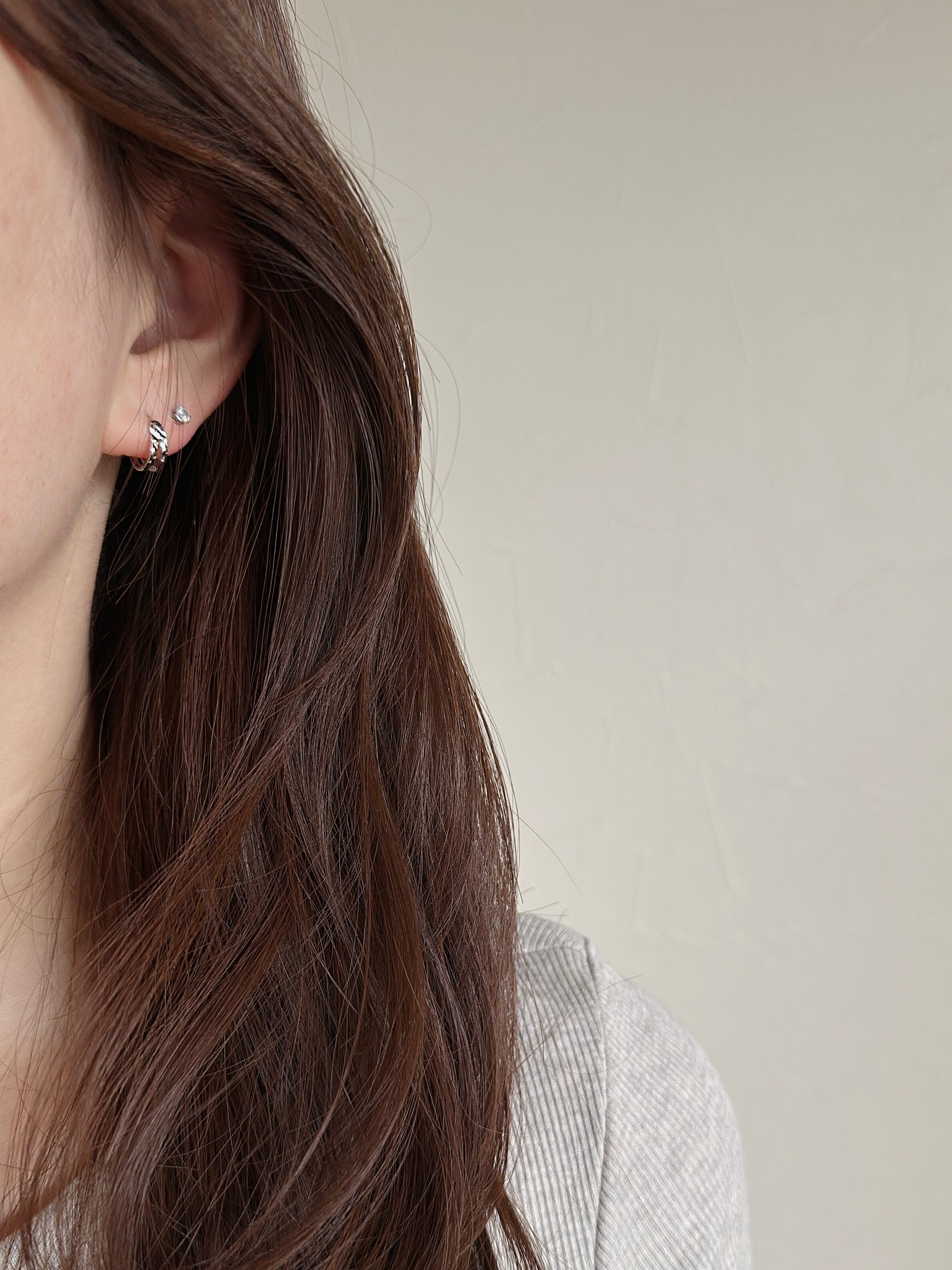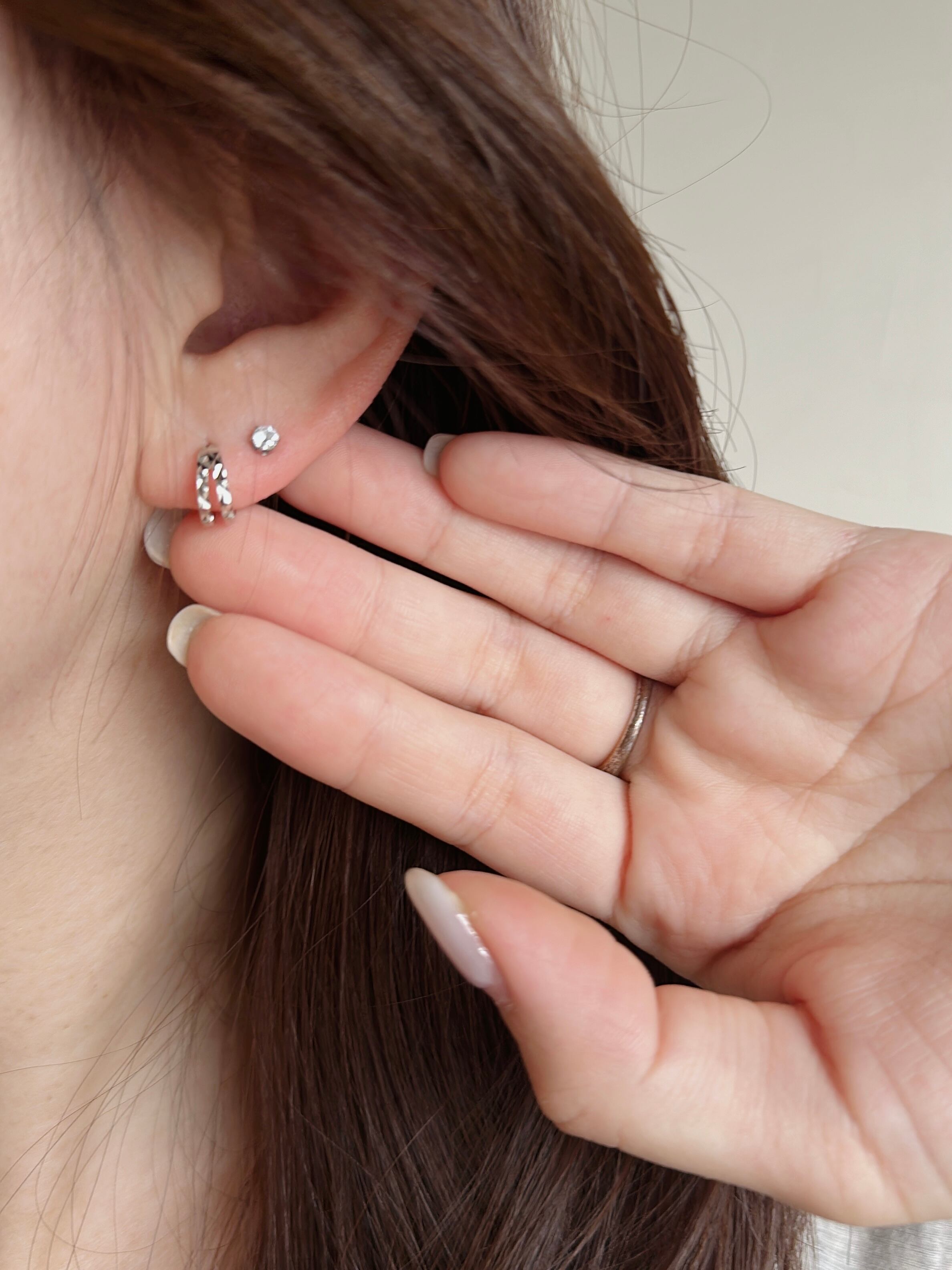 ひとつでつけるのはもちろん、手持ちの小さめピアスやイヤーカフとのレイヤードもおすすめ。