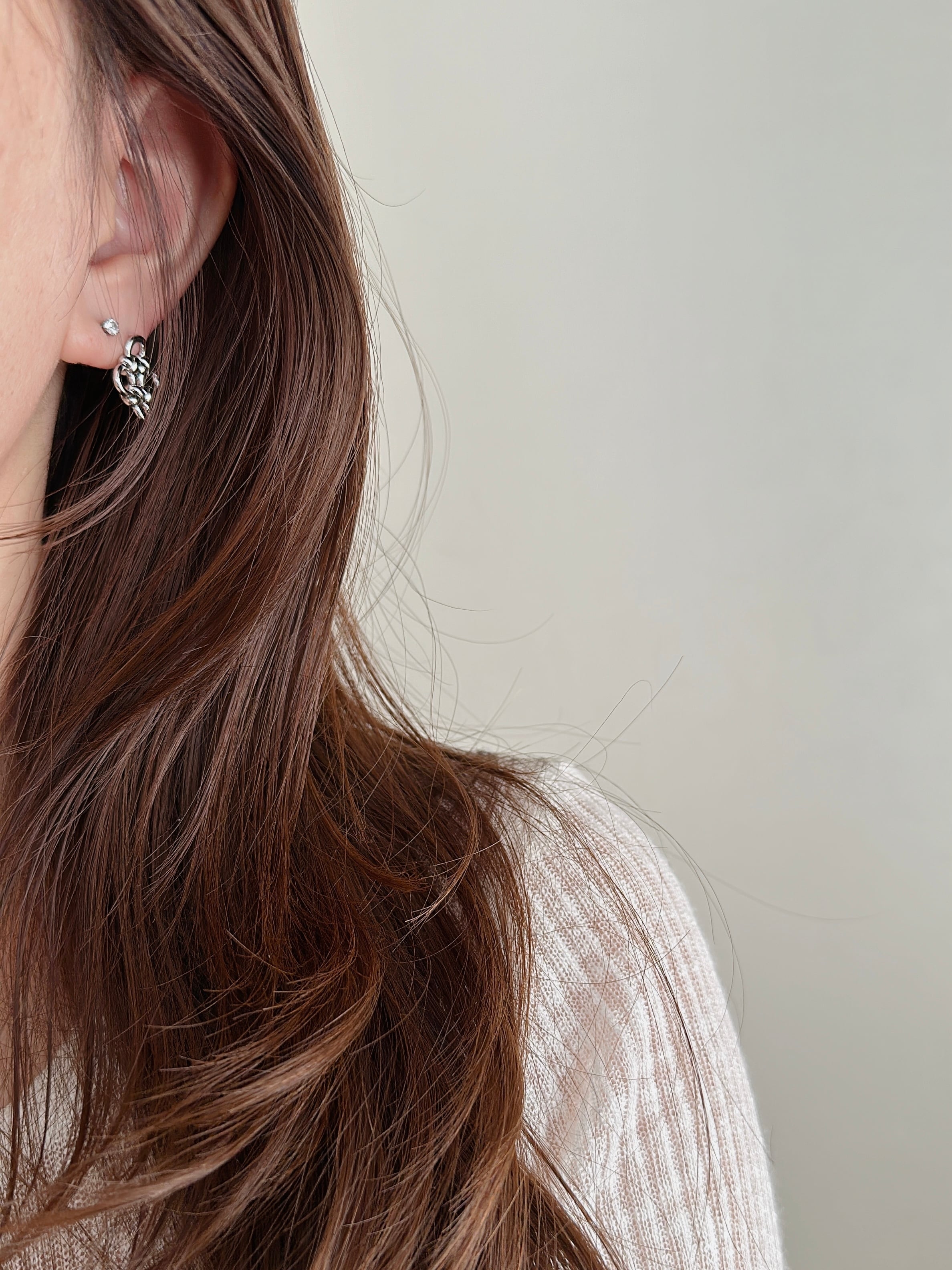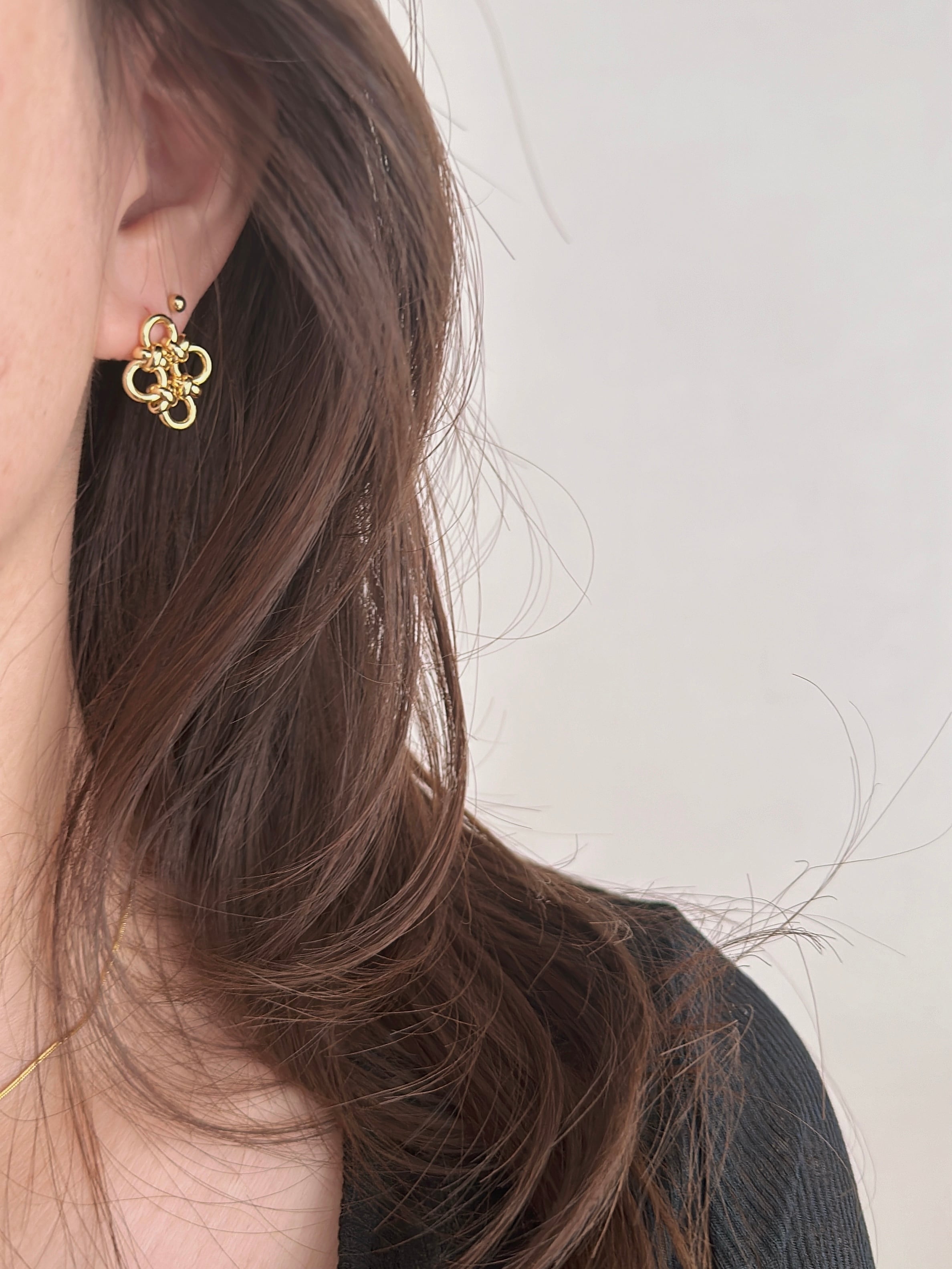 結び目のように絡み合う立体的なモチーフが印象的な、ノンスタンダードなデザインピアス。