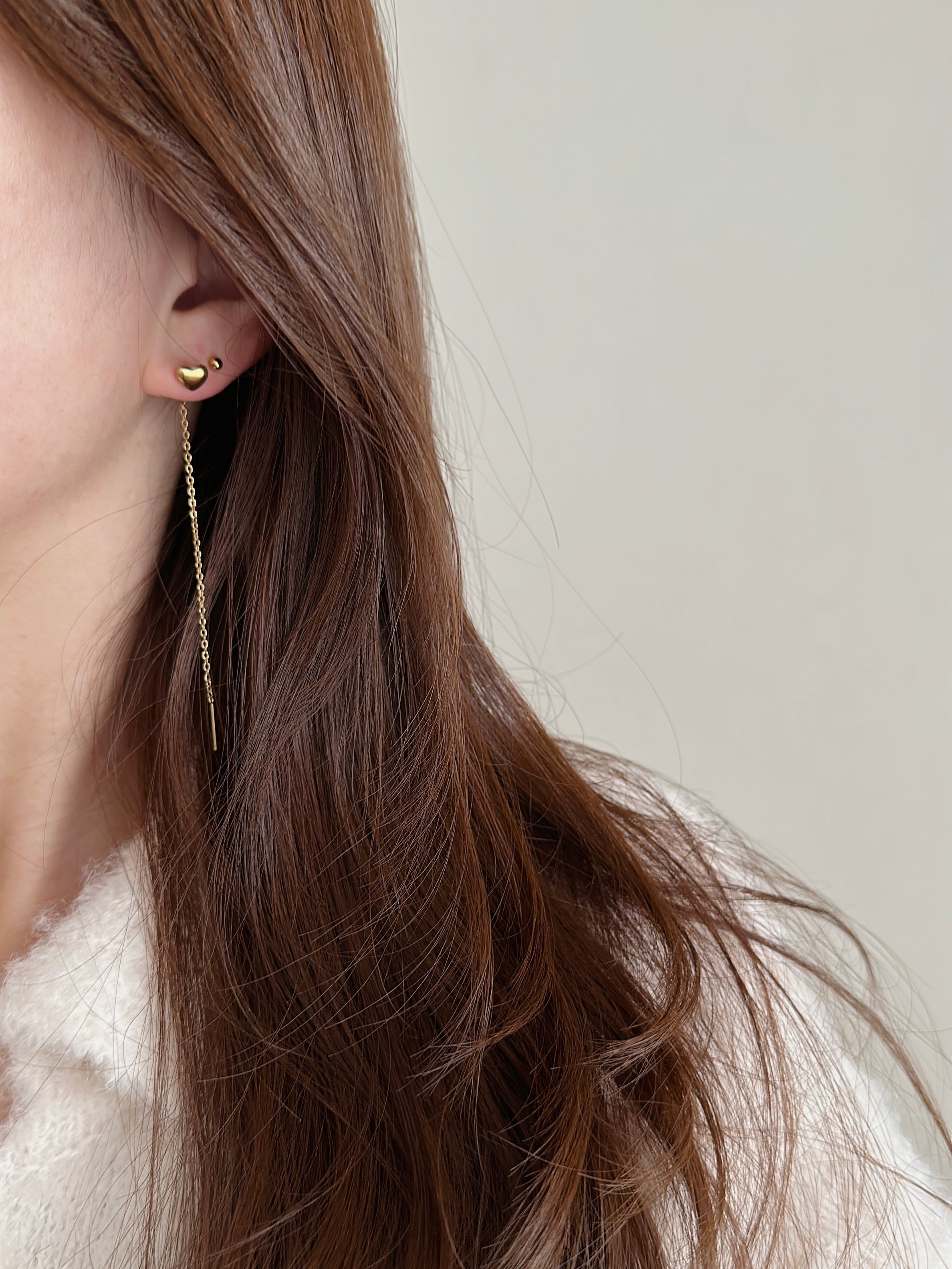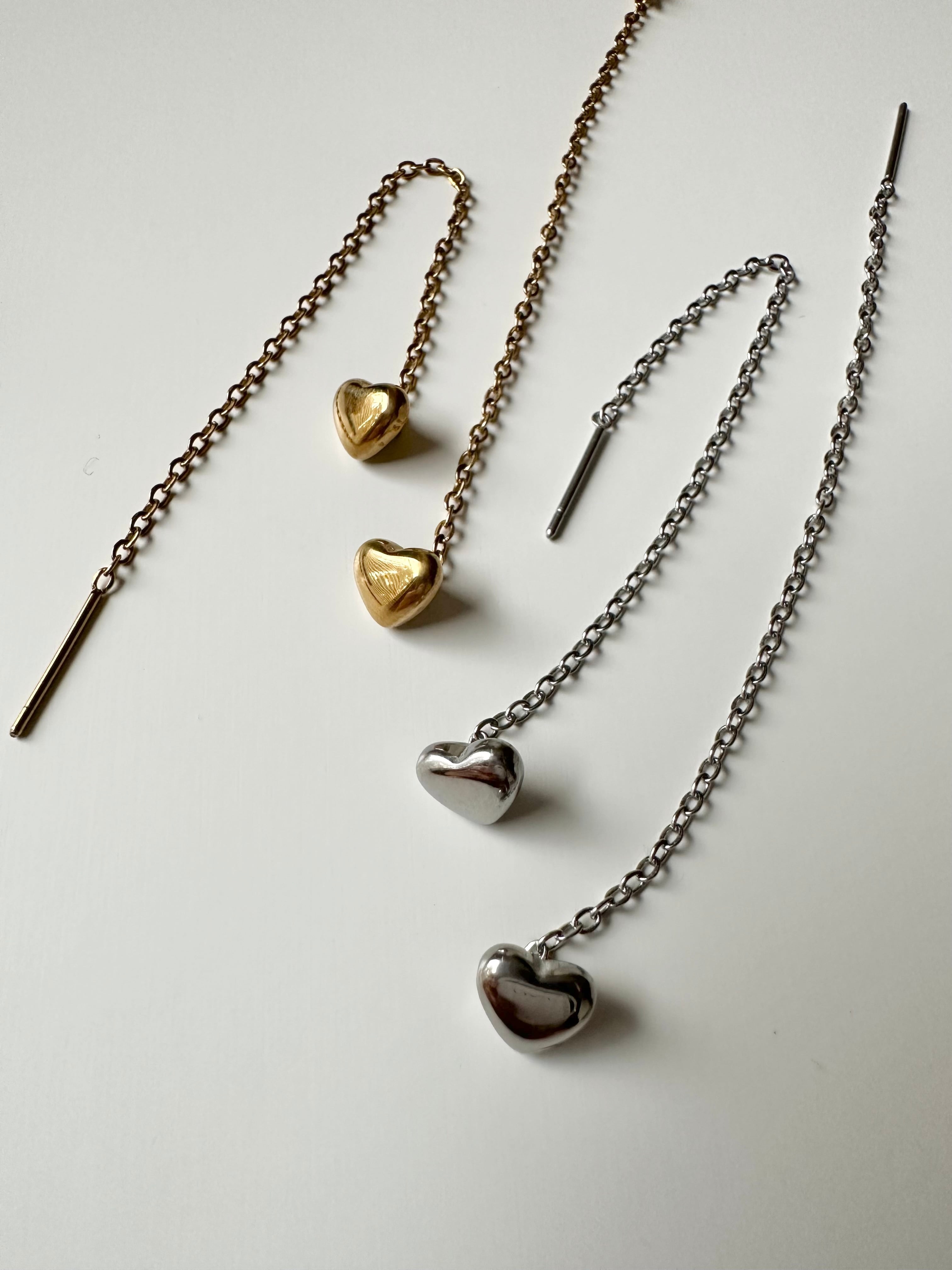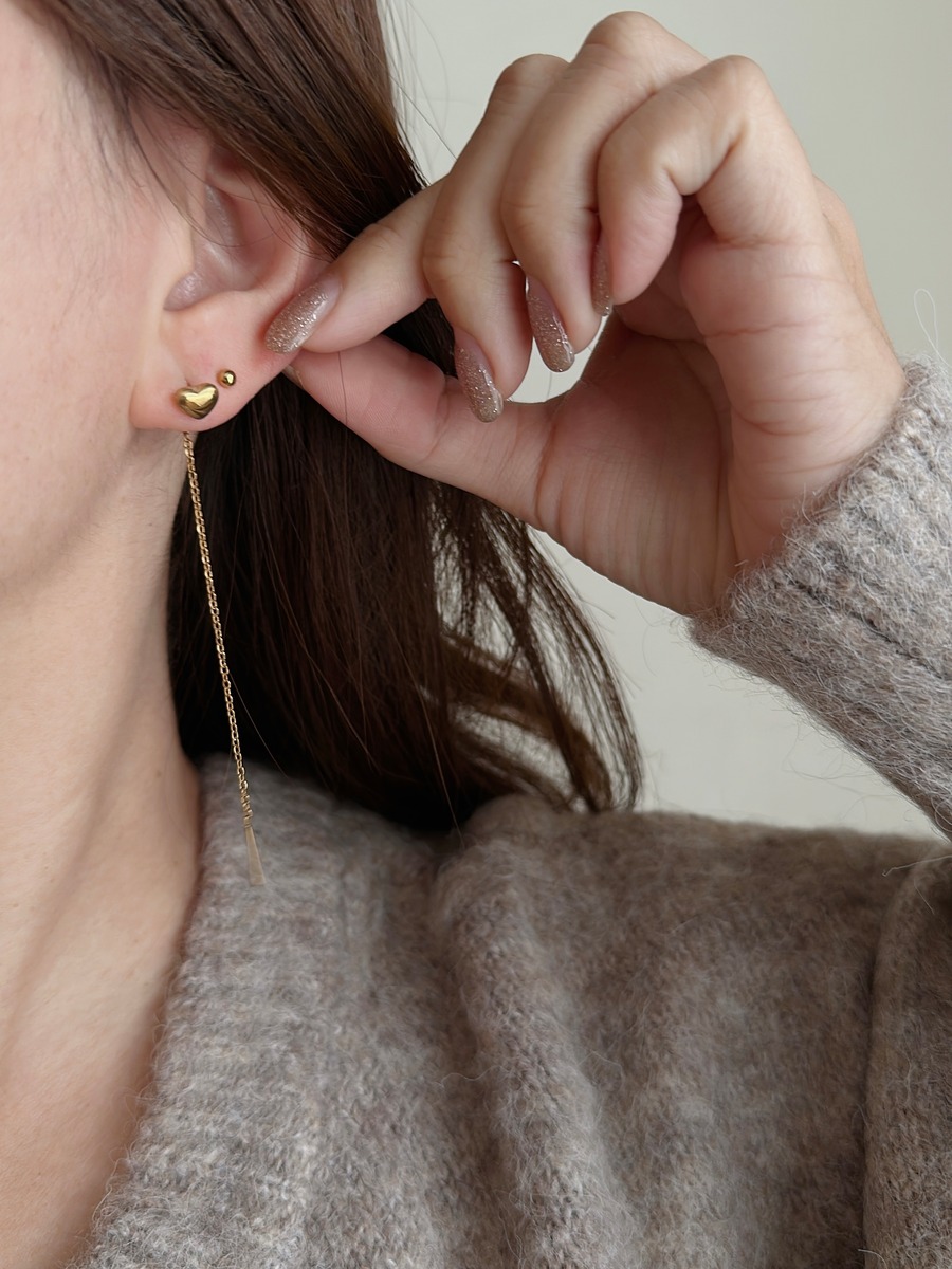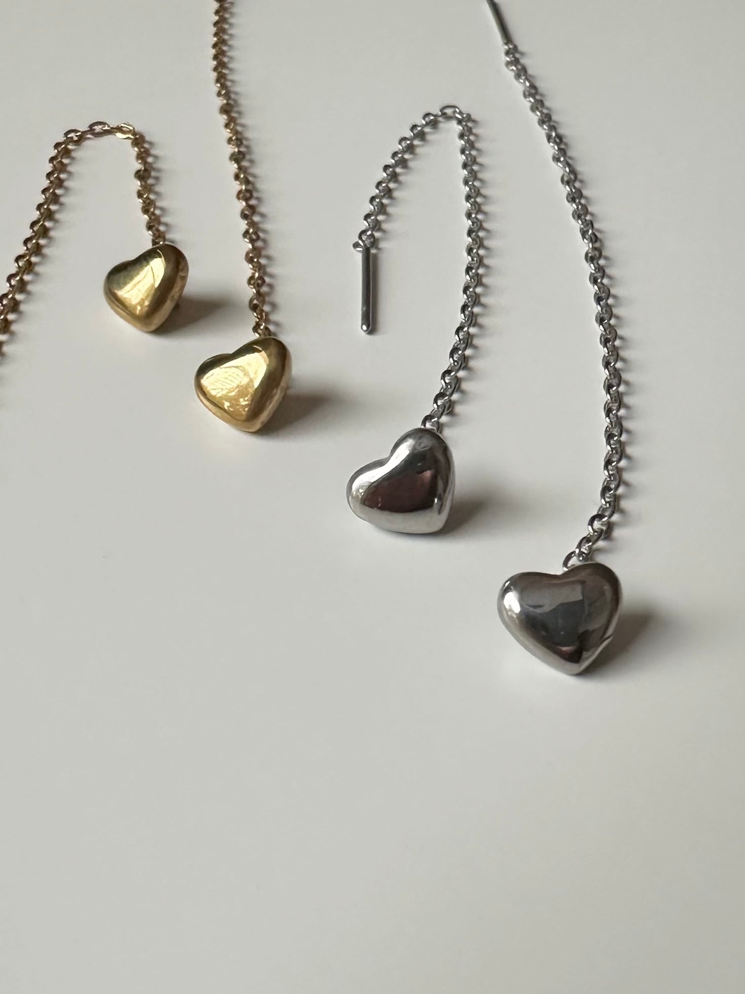 ぷっくりと立体感のあるハートが揺れる、印象的なロングチェーンピアス。