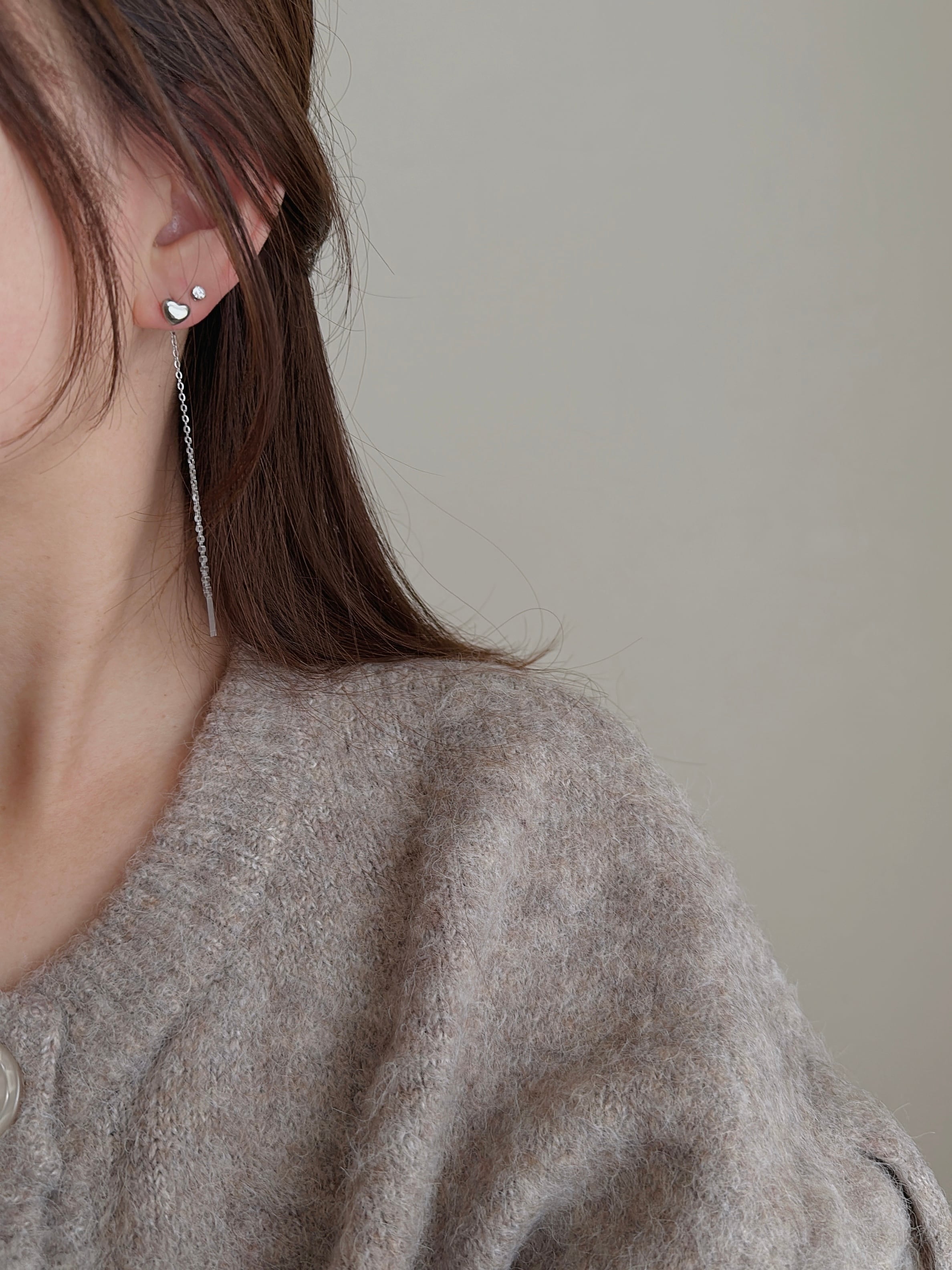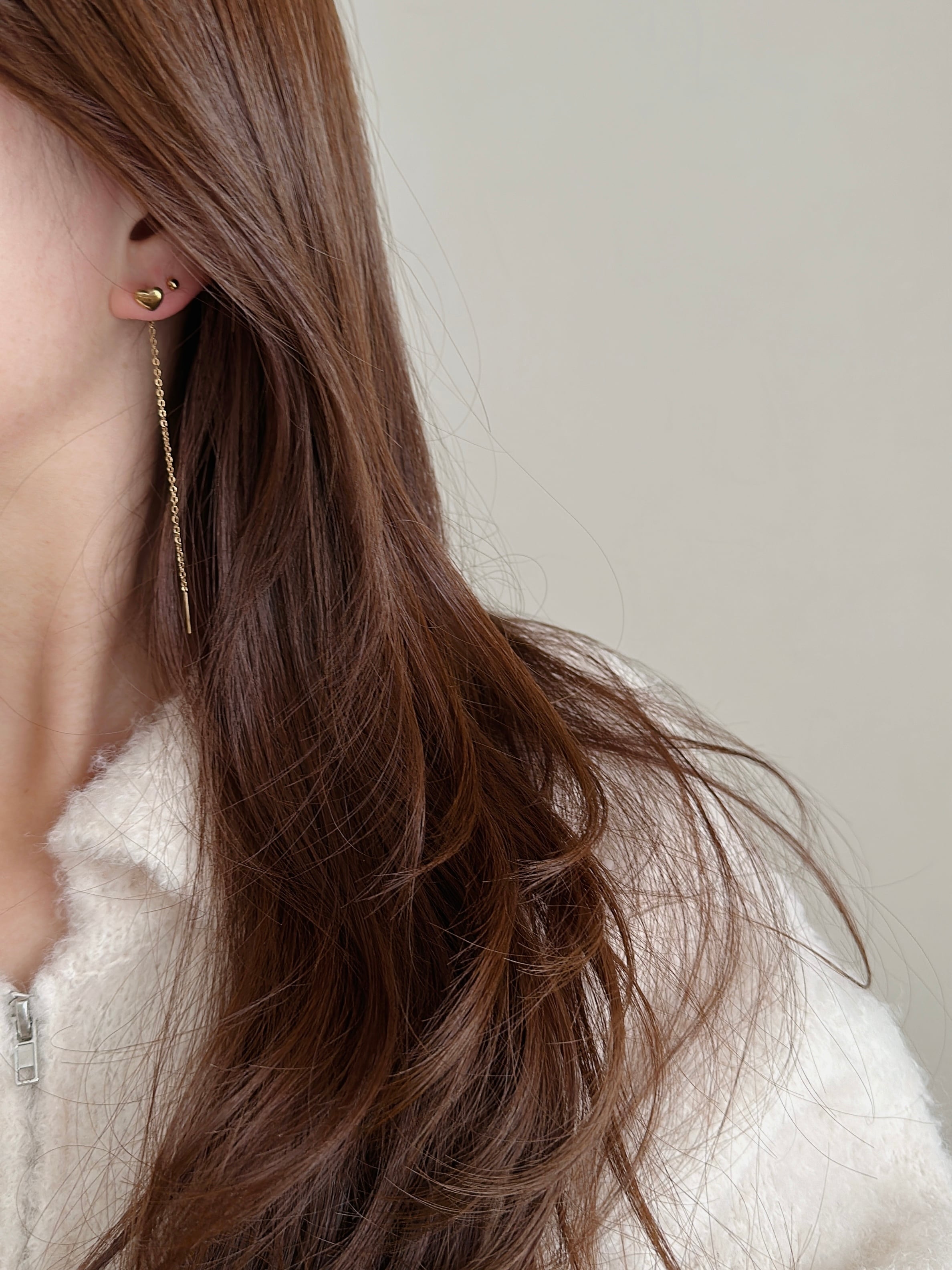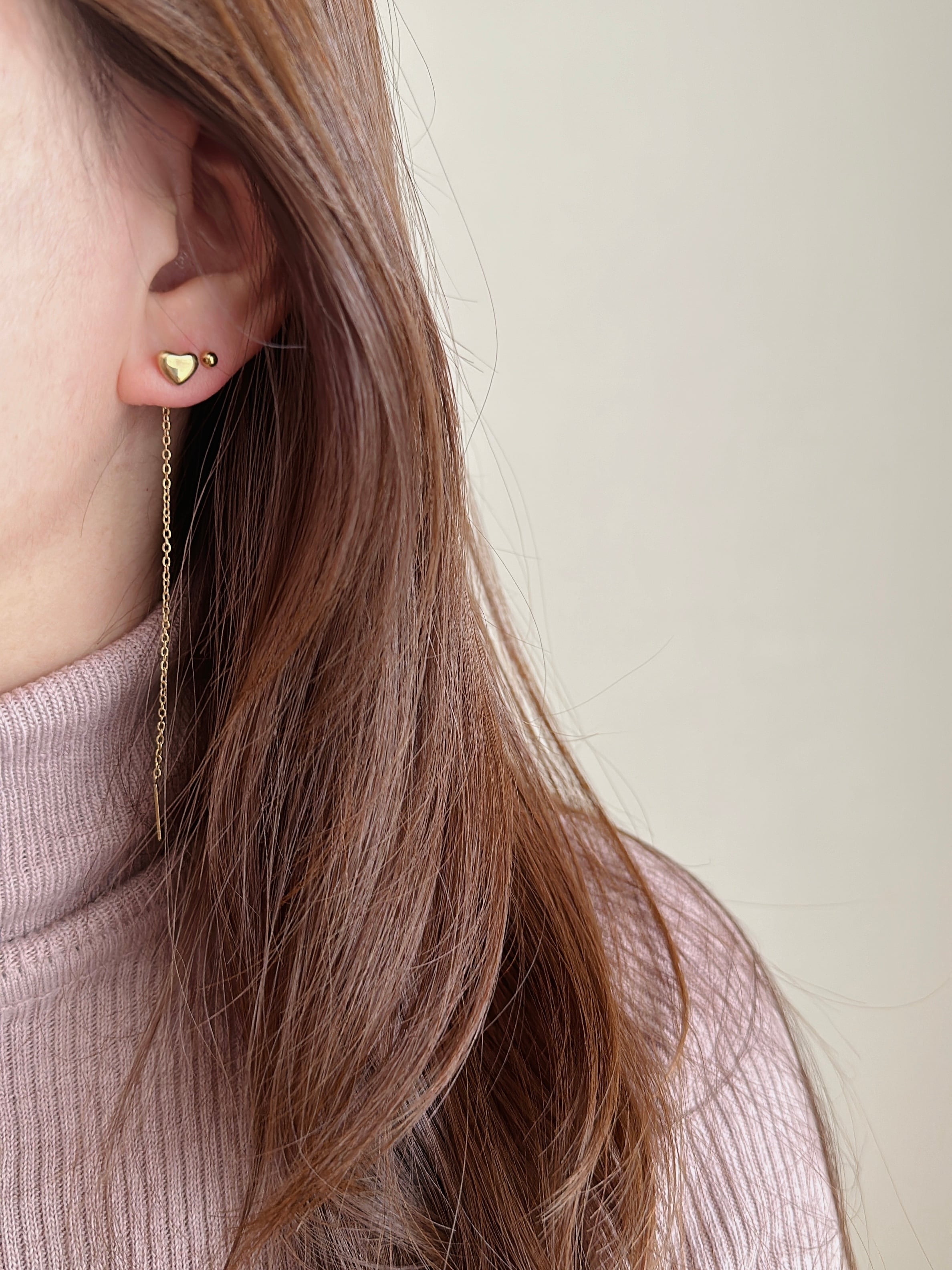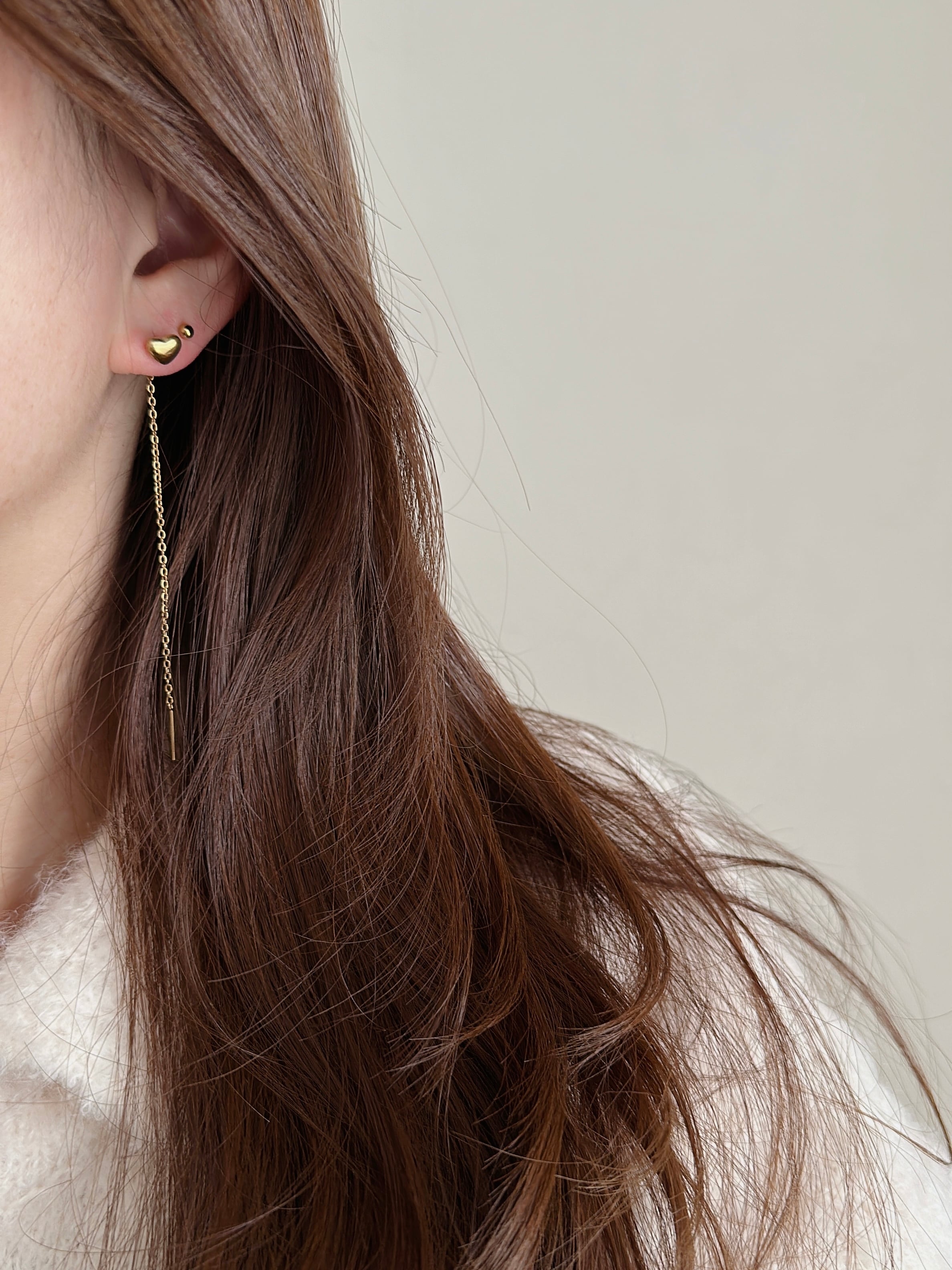ぷっくりと立体感のあるハートが揺れる、印象的なロングチェーンピアス。