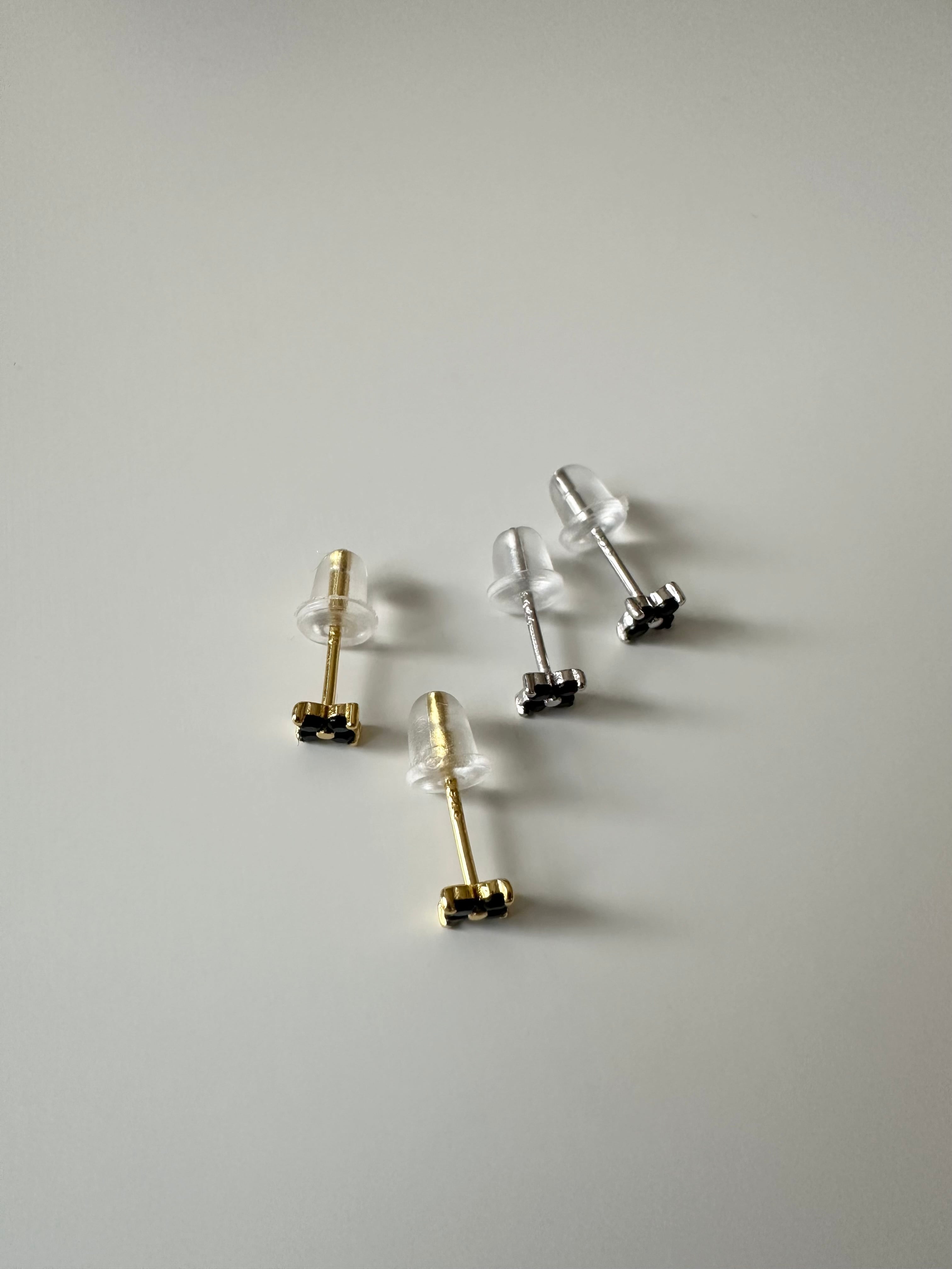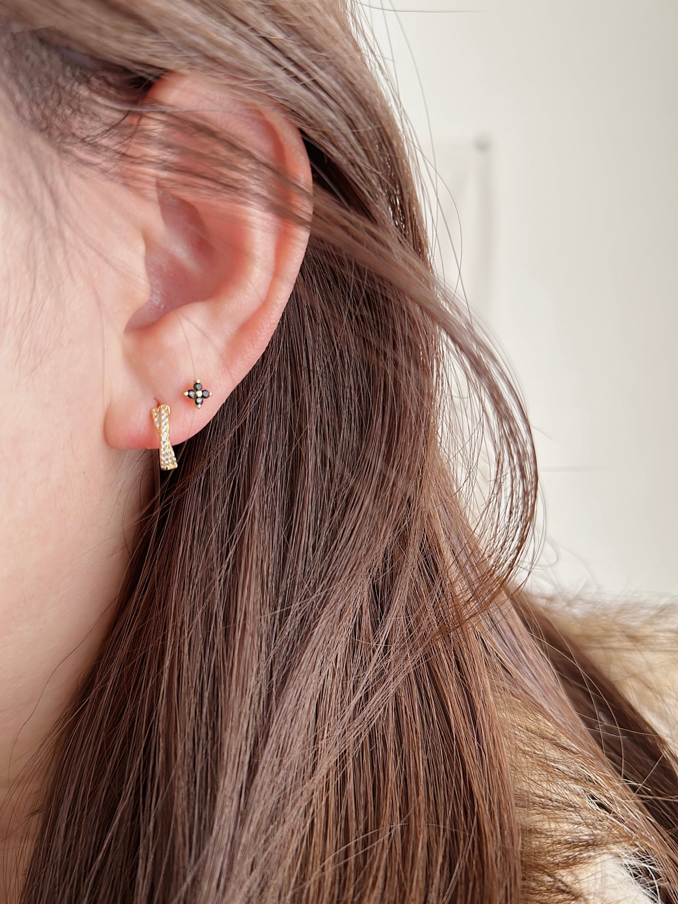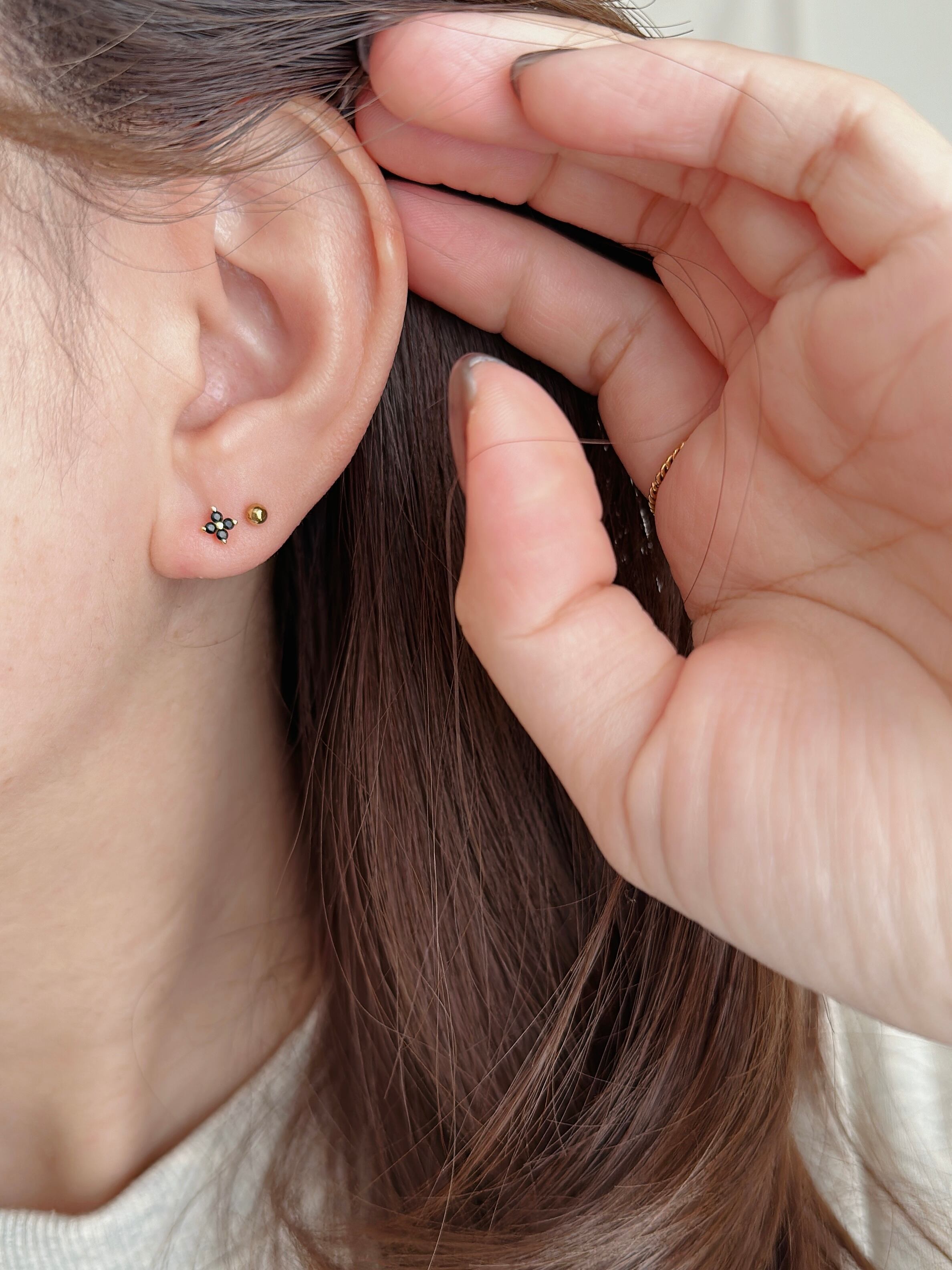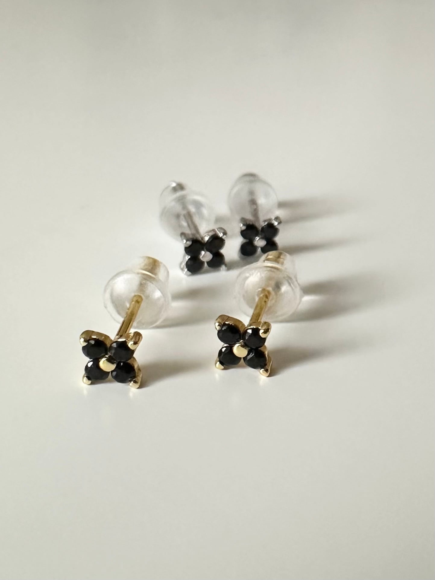 小粒のブラックジルコンを4粒組み合わせた、可憐なフラワーモチーフが耳元でそっと輝くスタッドピアス。