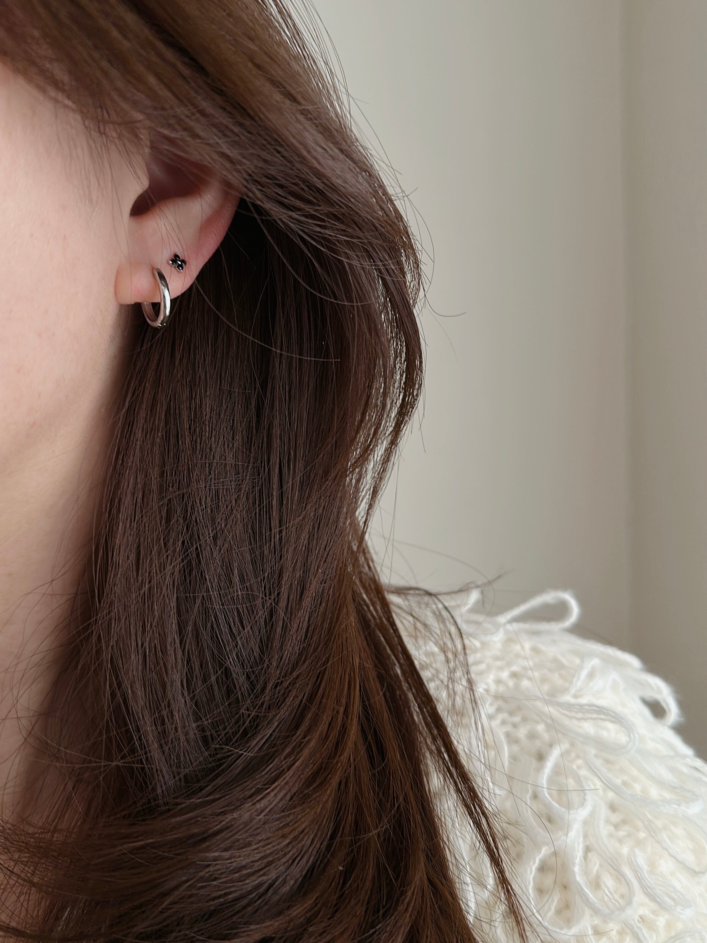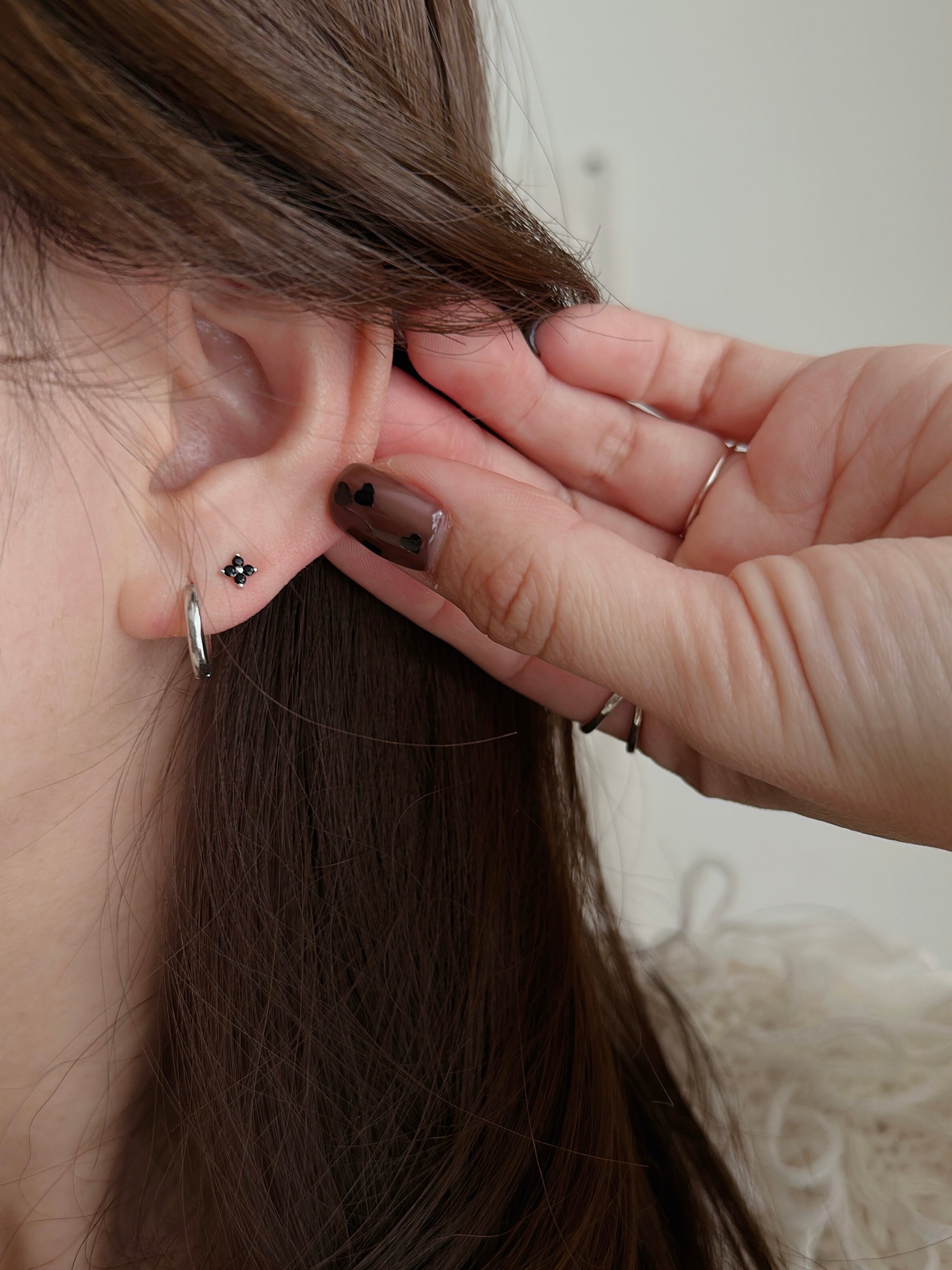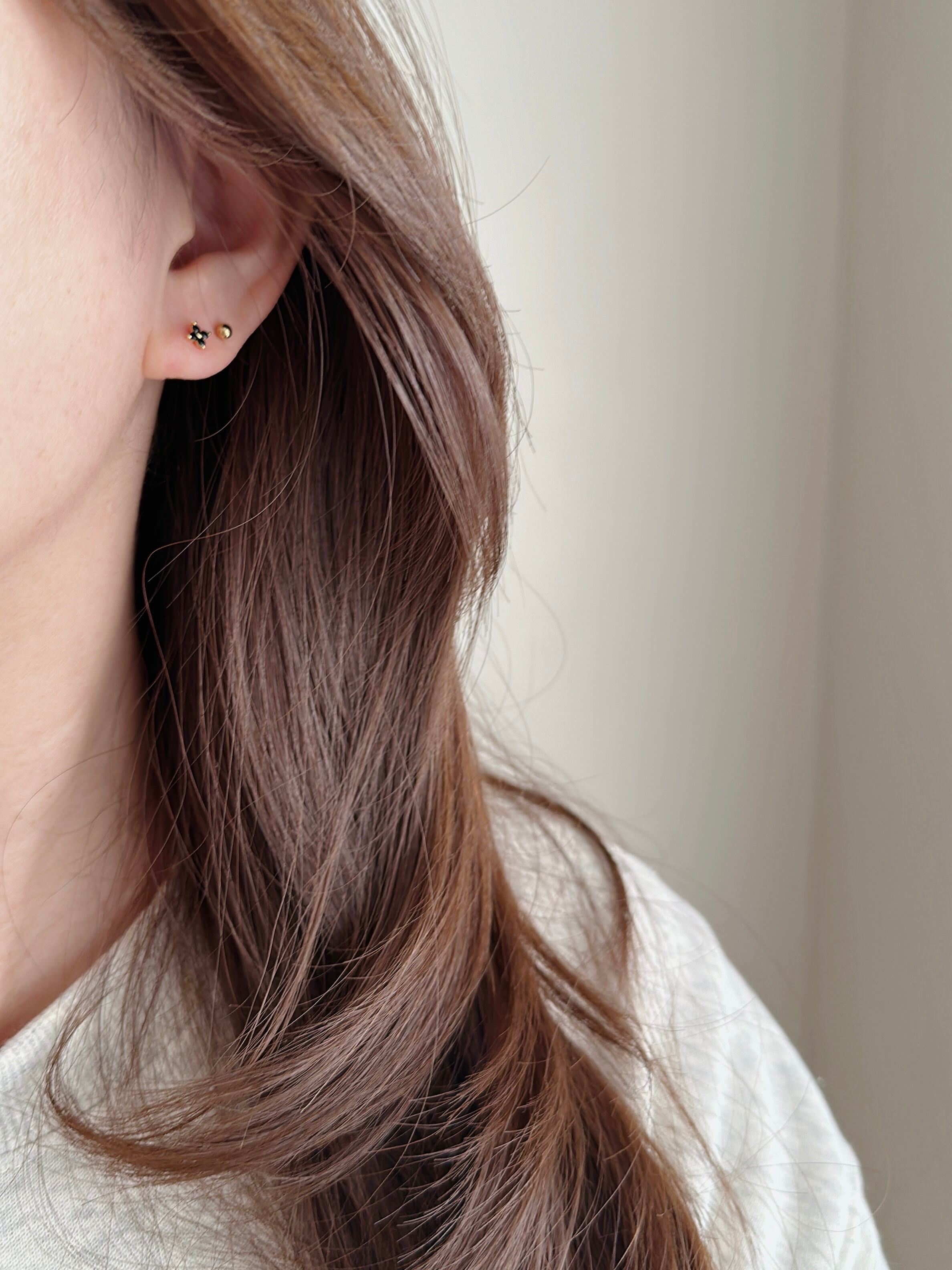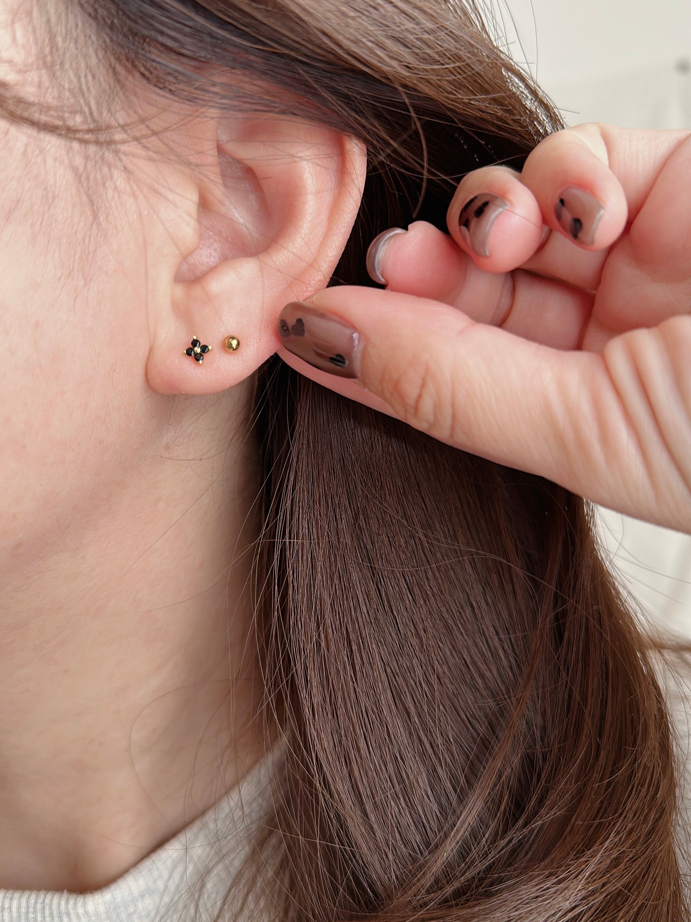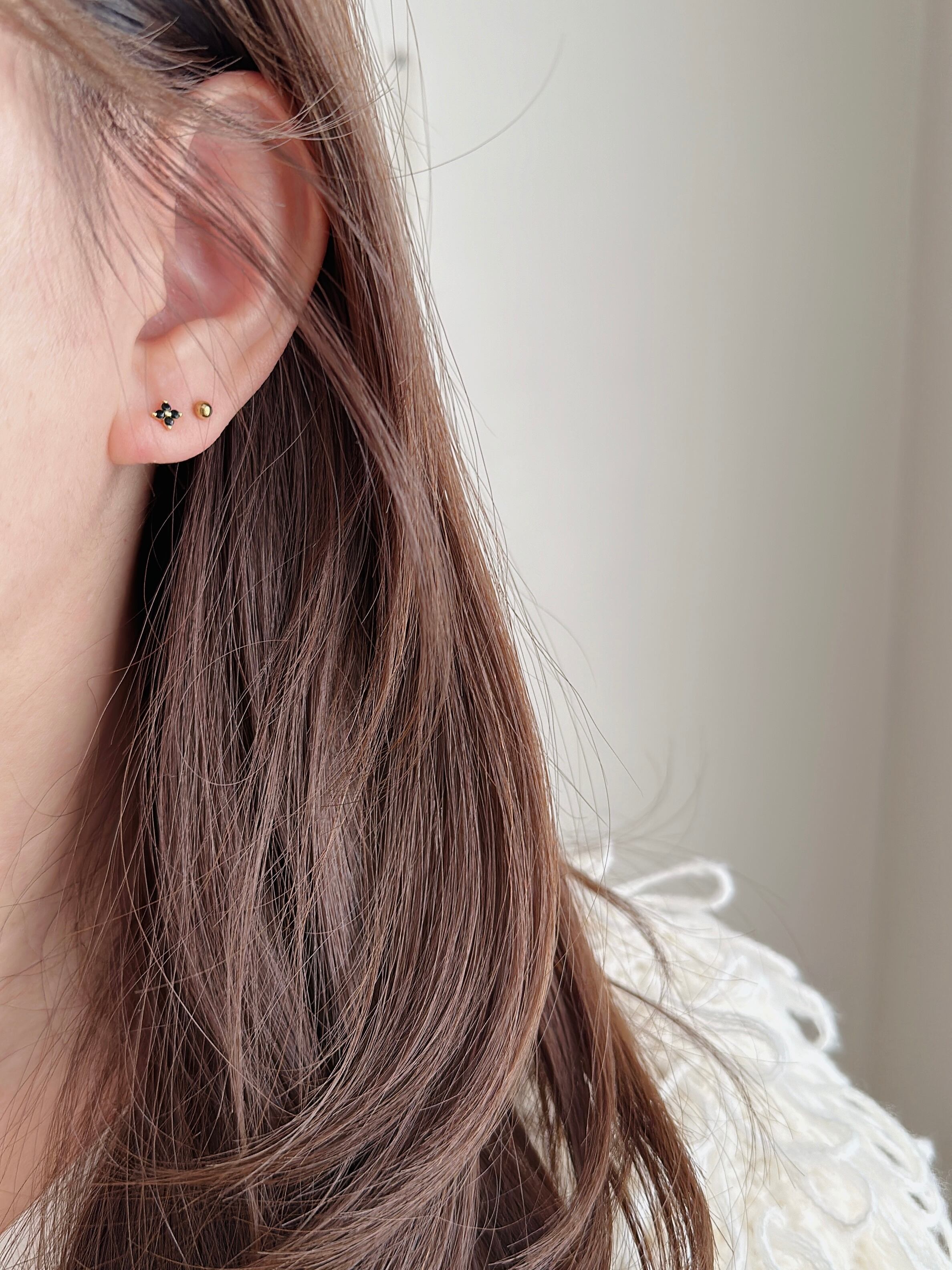 繊細なサイズ感ながら、ブラックのカラーが程よい存在感をプラスし、甘くなりすぎない大人の可愛さを演出します。シンプルな装いにアクセントとして取り入れるのはもちろん、他のピアスとのレイヤードにもぴったりなデザイン。