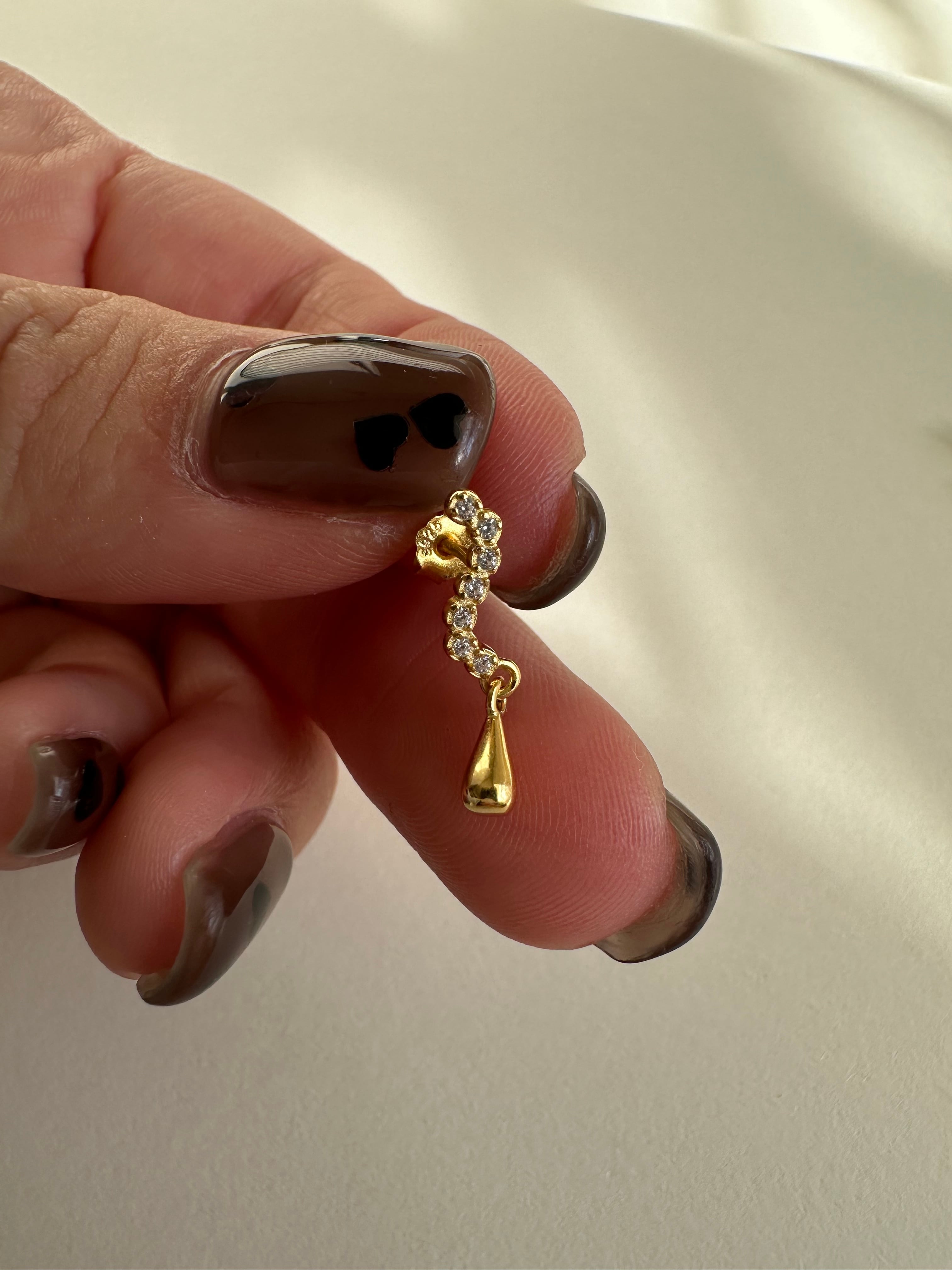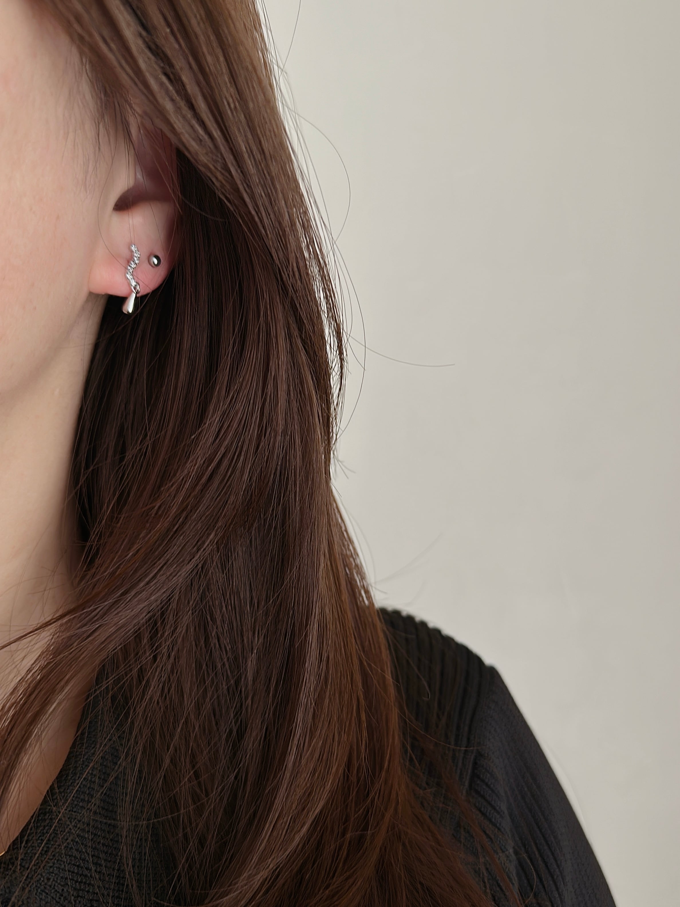 【S925 ラインストーンドロップピアス】は、繊細なラインストーンをあしらった曲線ラインに、なめらかなドロップチャームが組み合わされたピアスです。