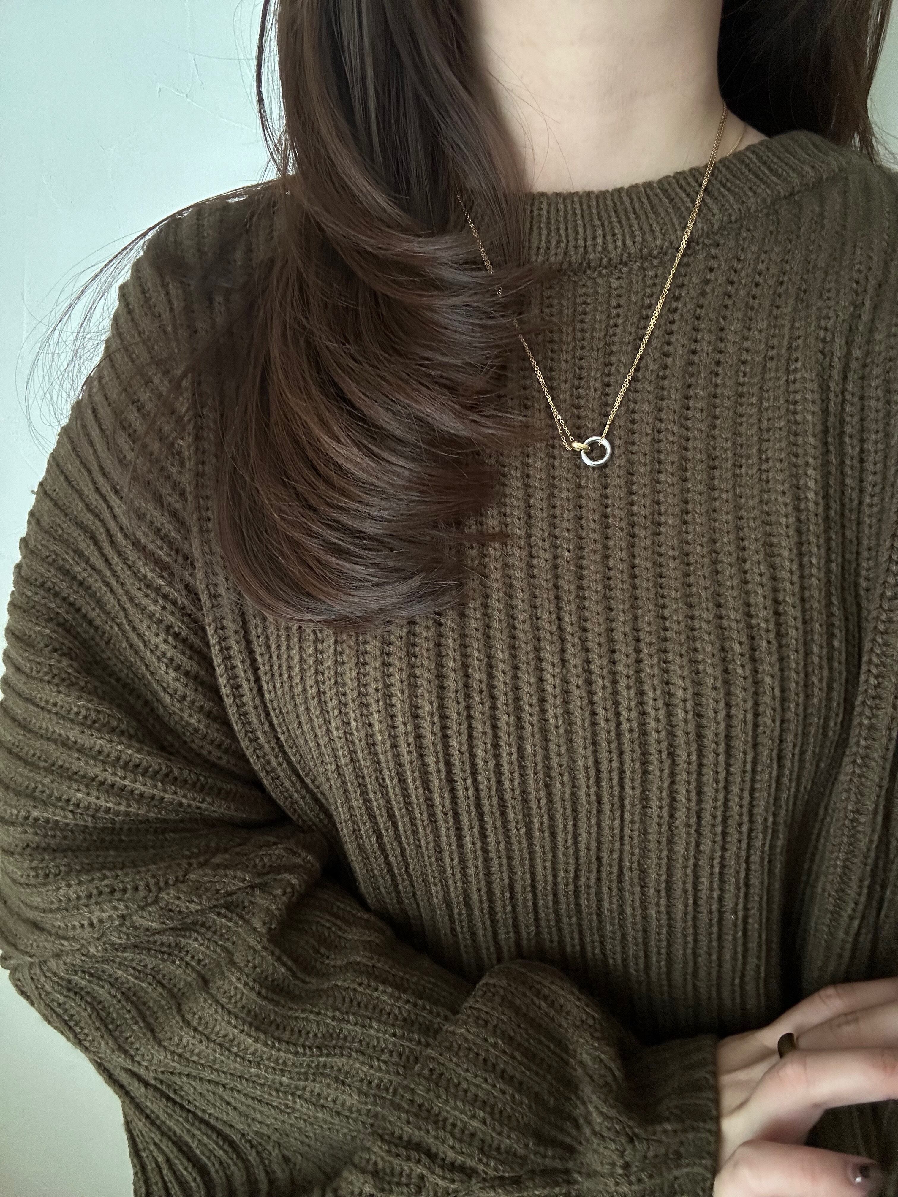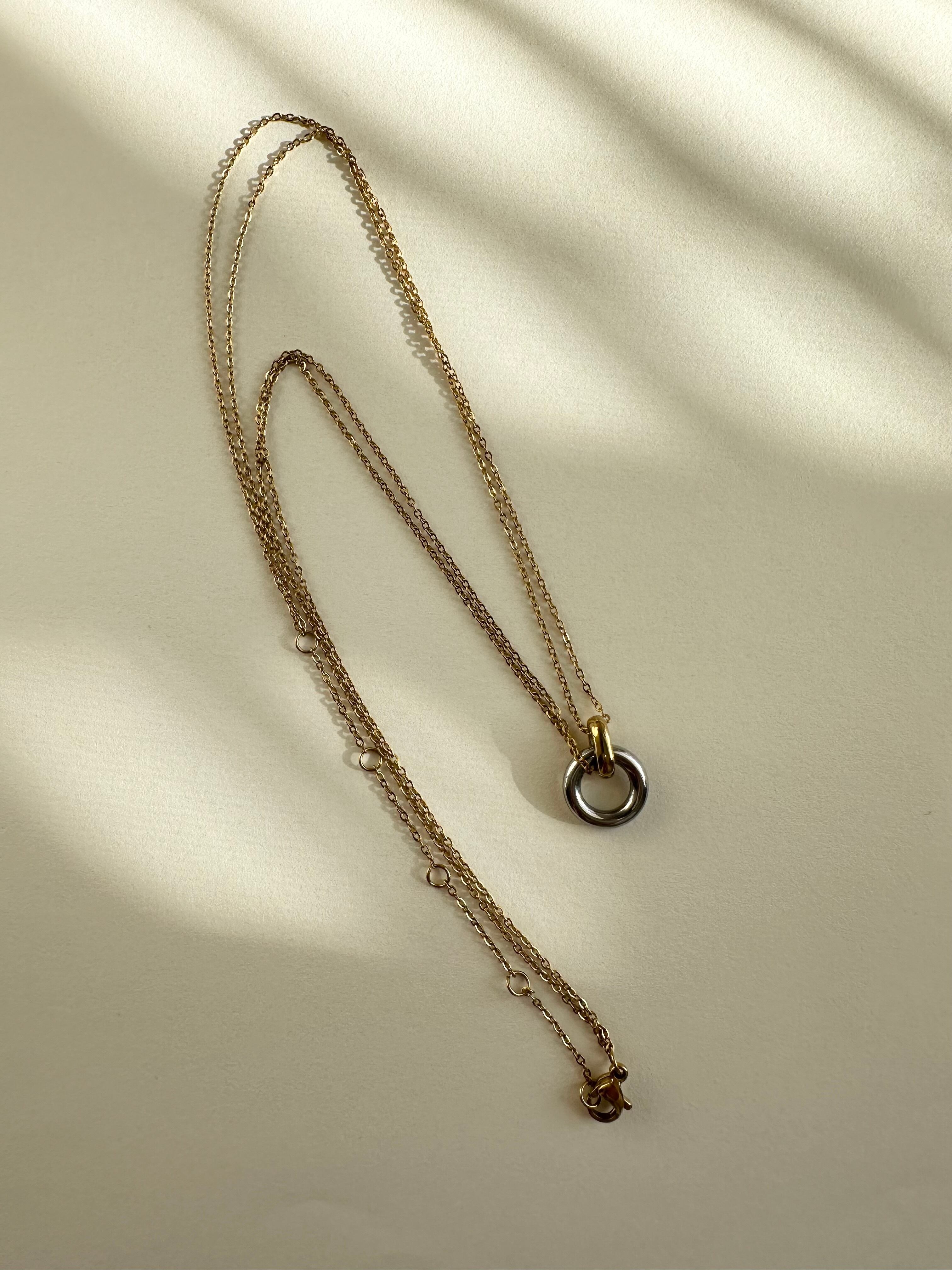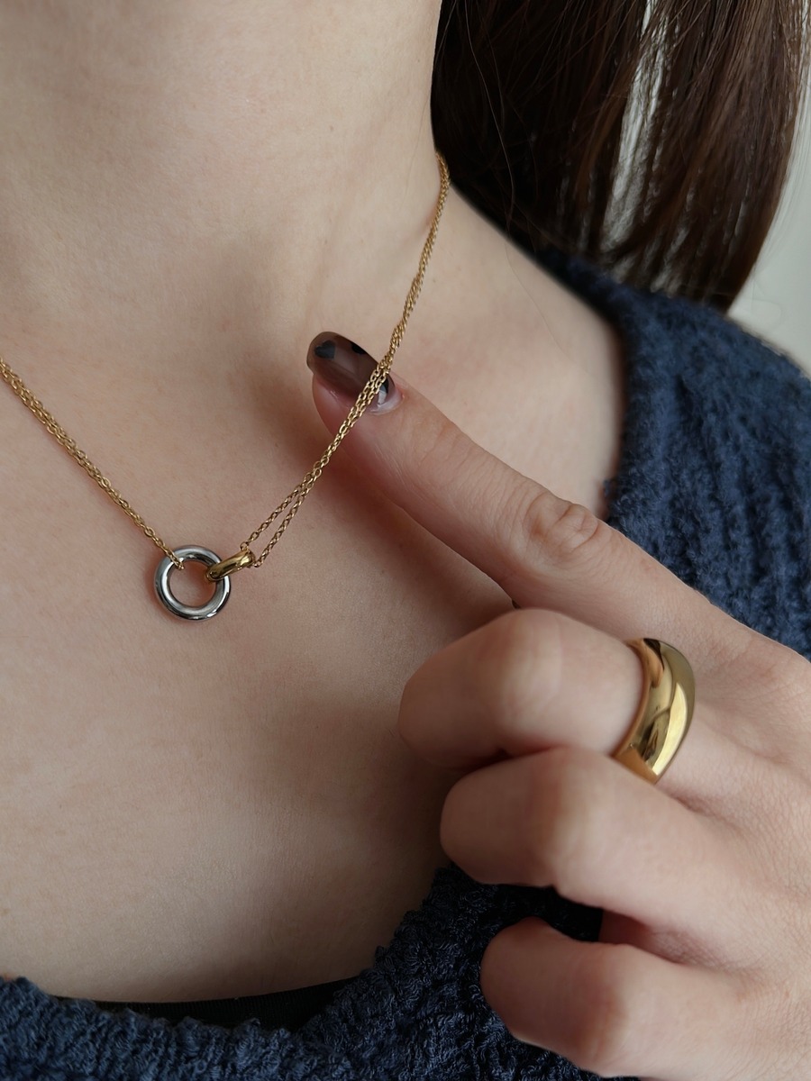 シンプルな中に個性が光る、ツーカラーのリングモチーフネックレス。