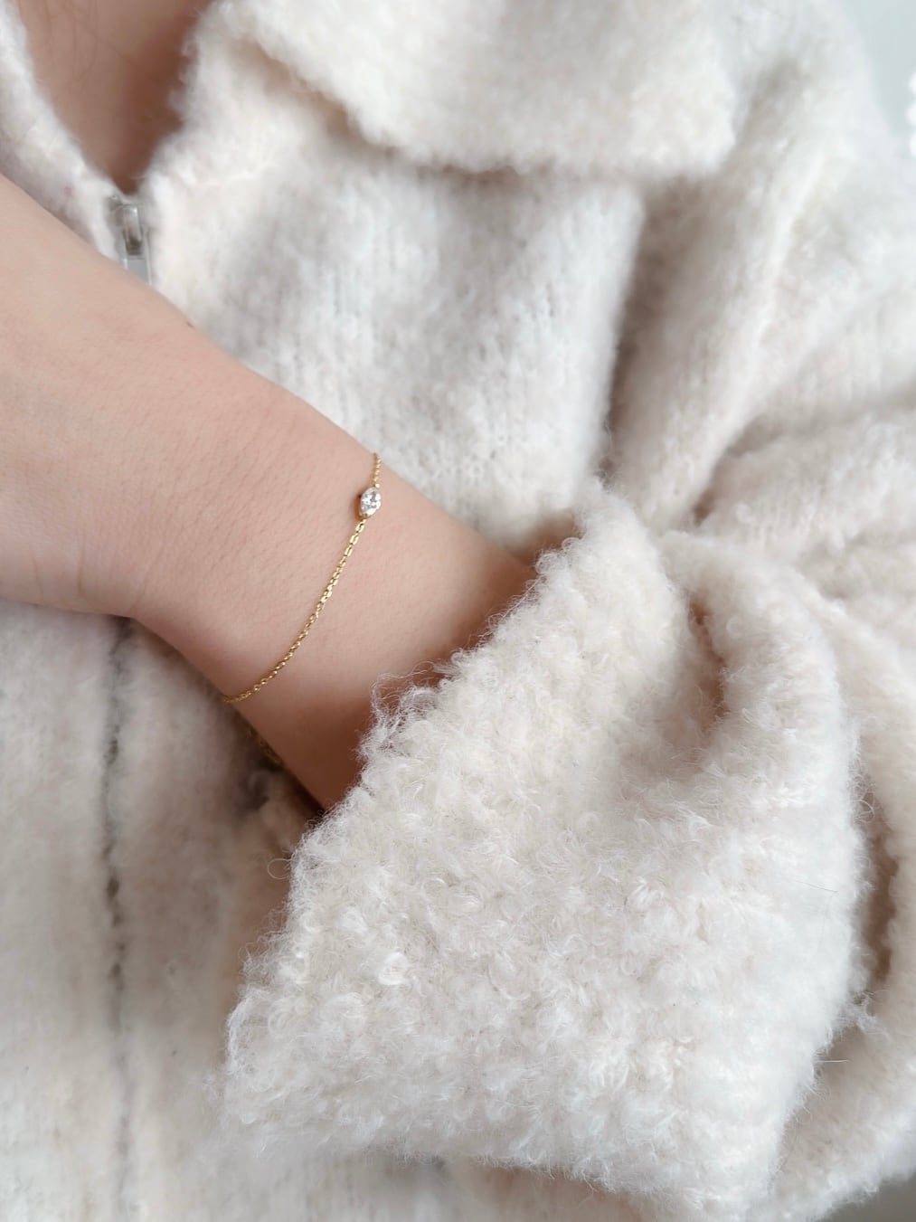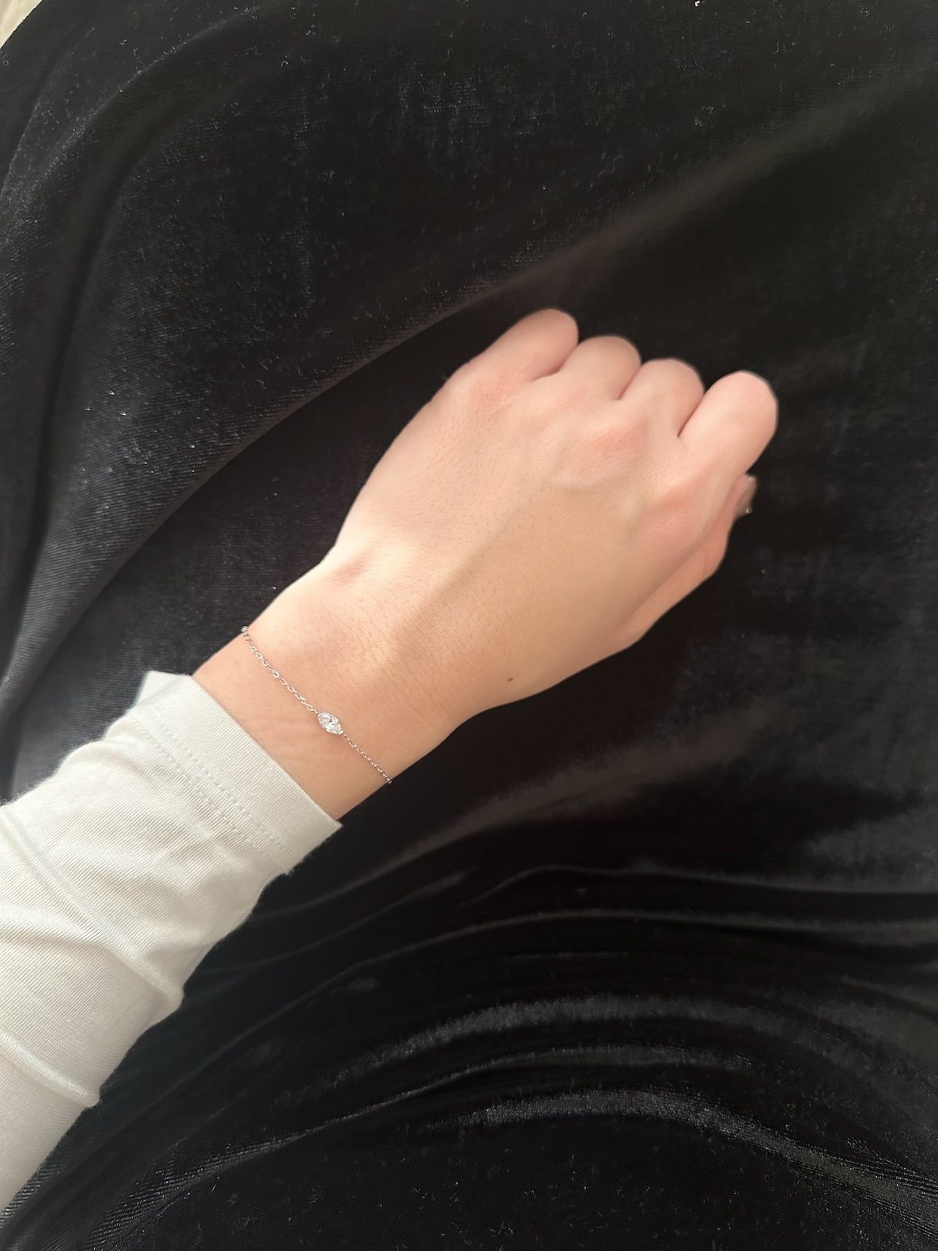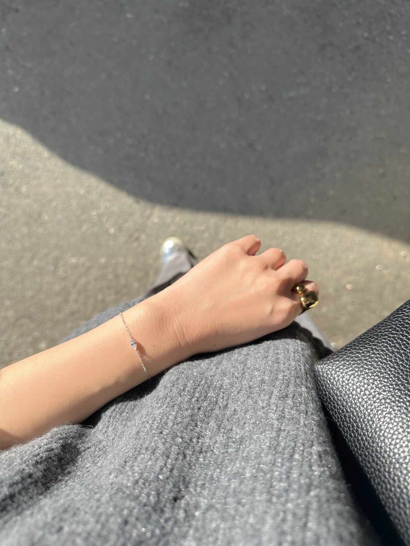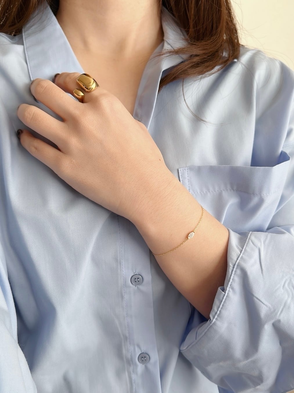 オーバルカットのストーンが、光の角度によってキラリと輝く上品なブレスレット。繊細なチェーンとミニマルなデザインで、どんなスタイルにも馴染みやすく、オフィスからお出かけシーンまで幅広く活躍します。