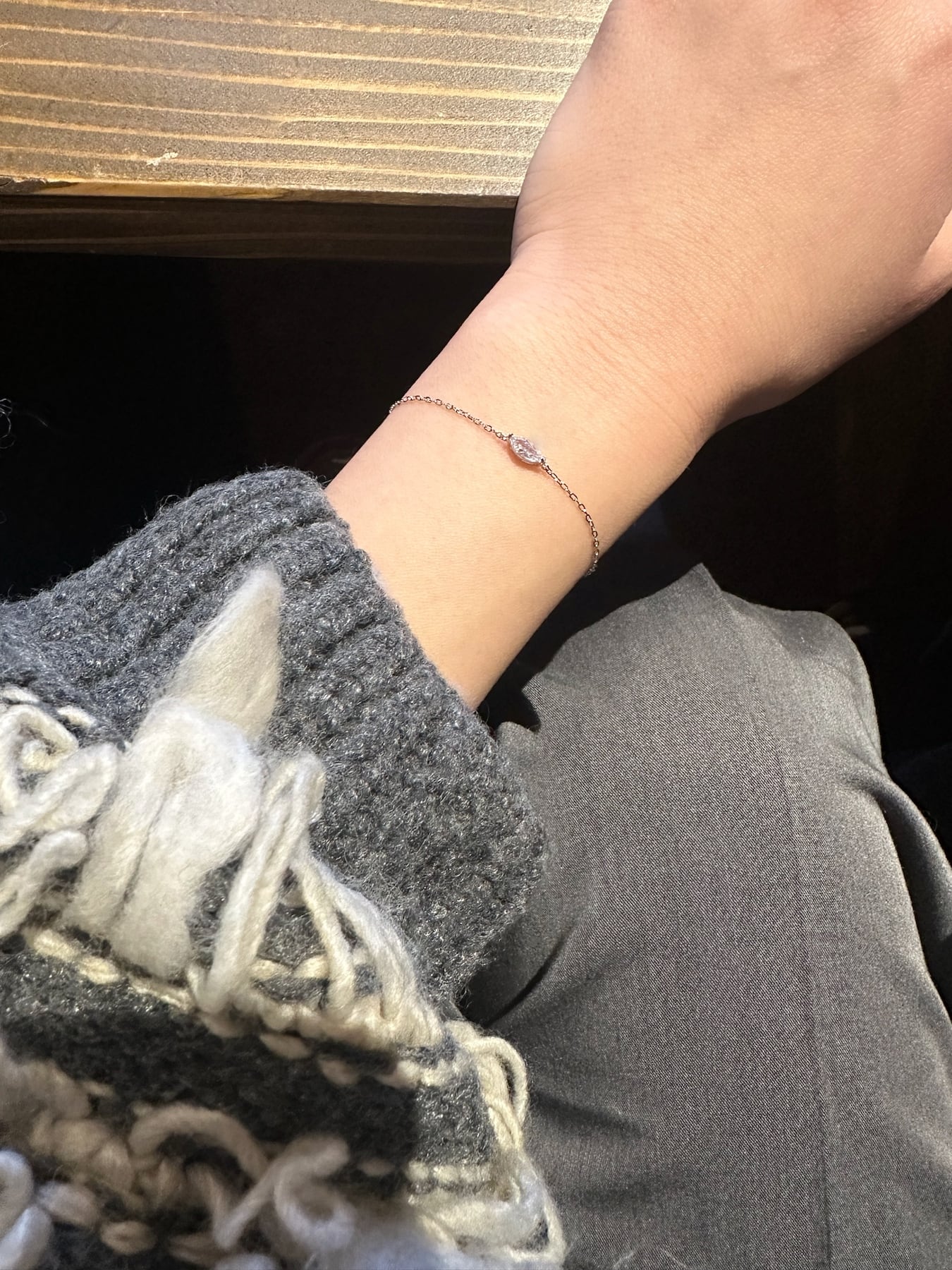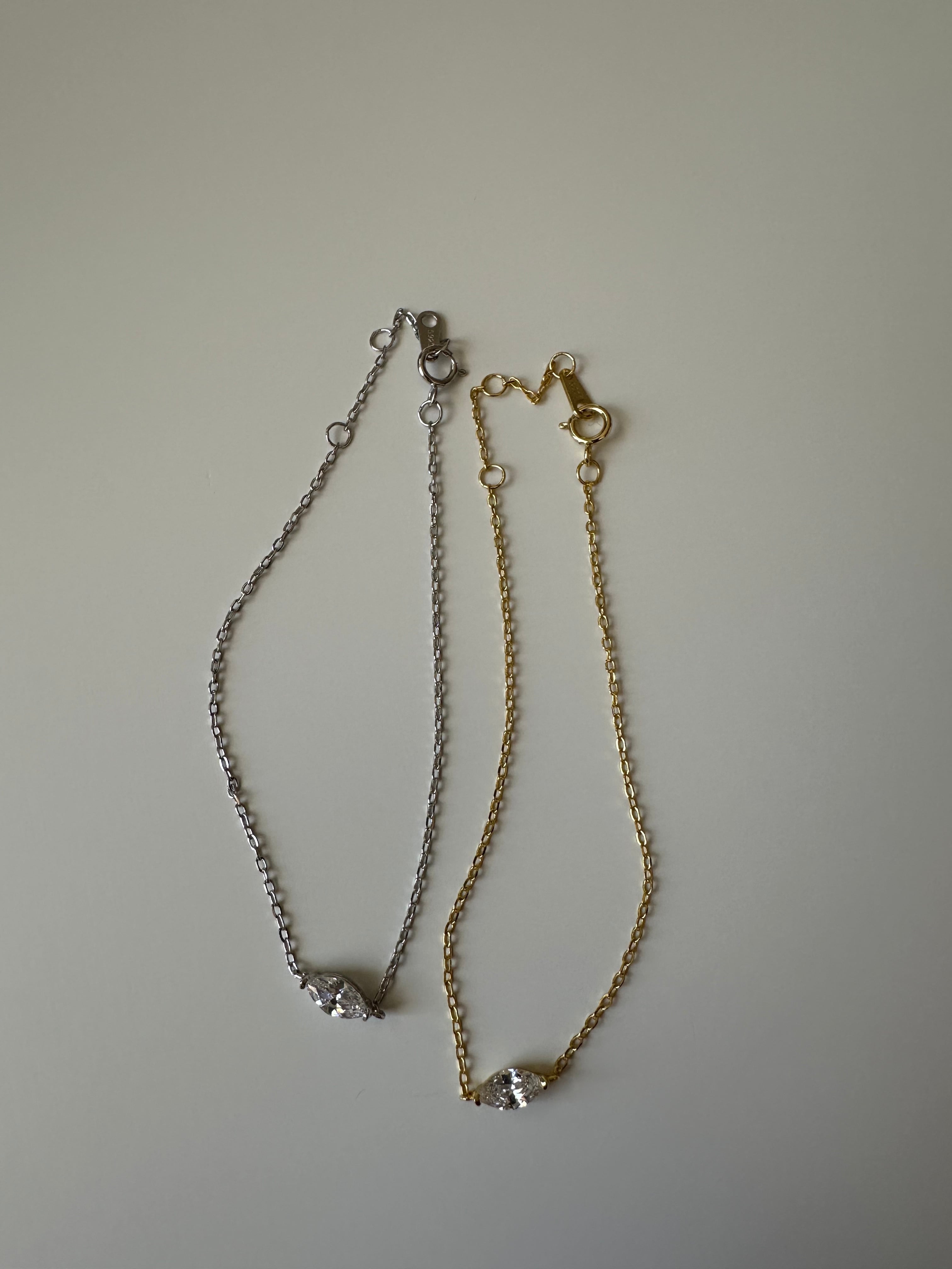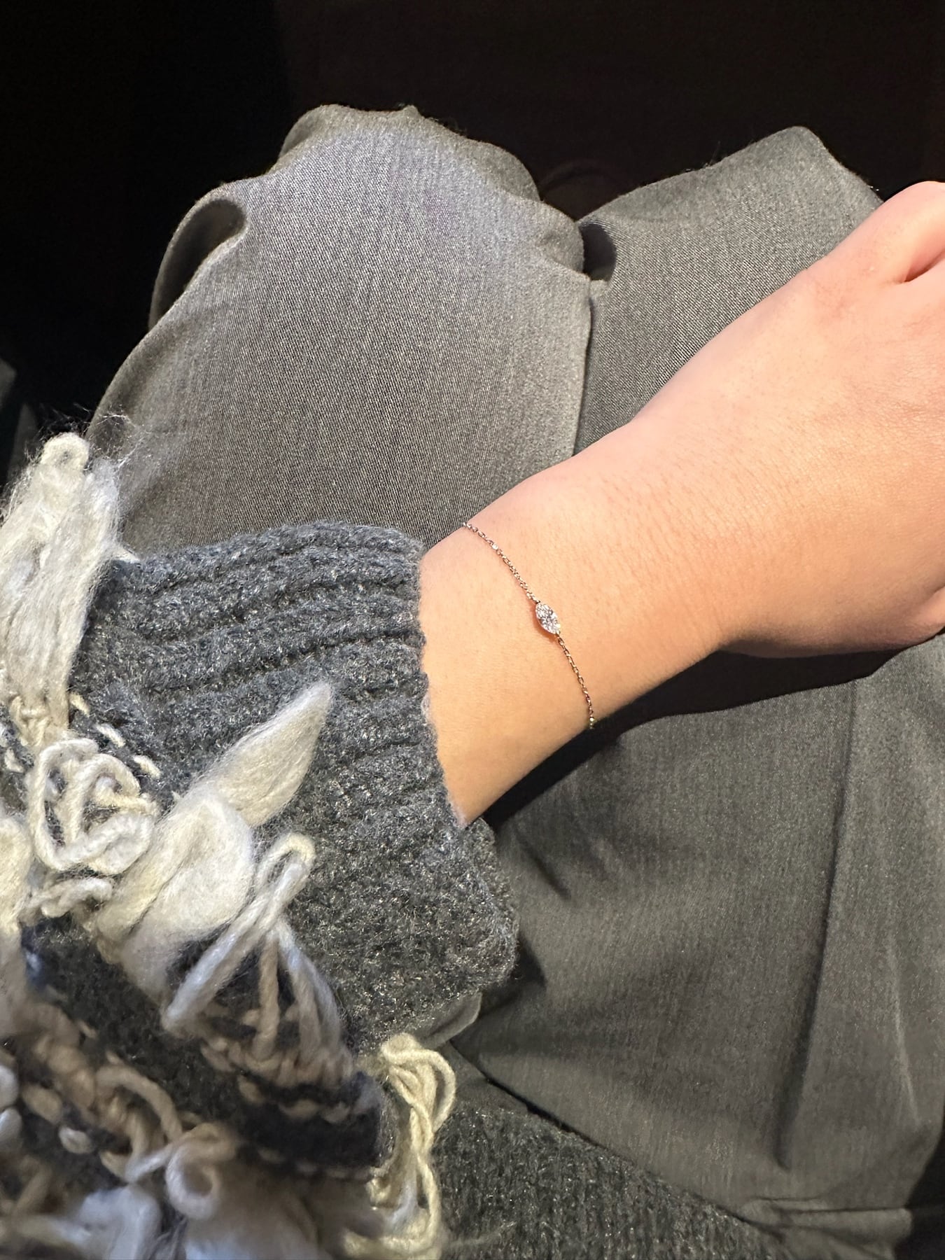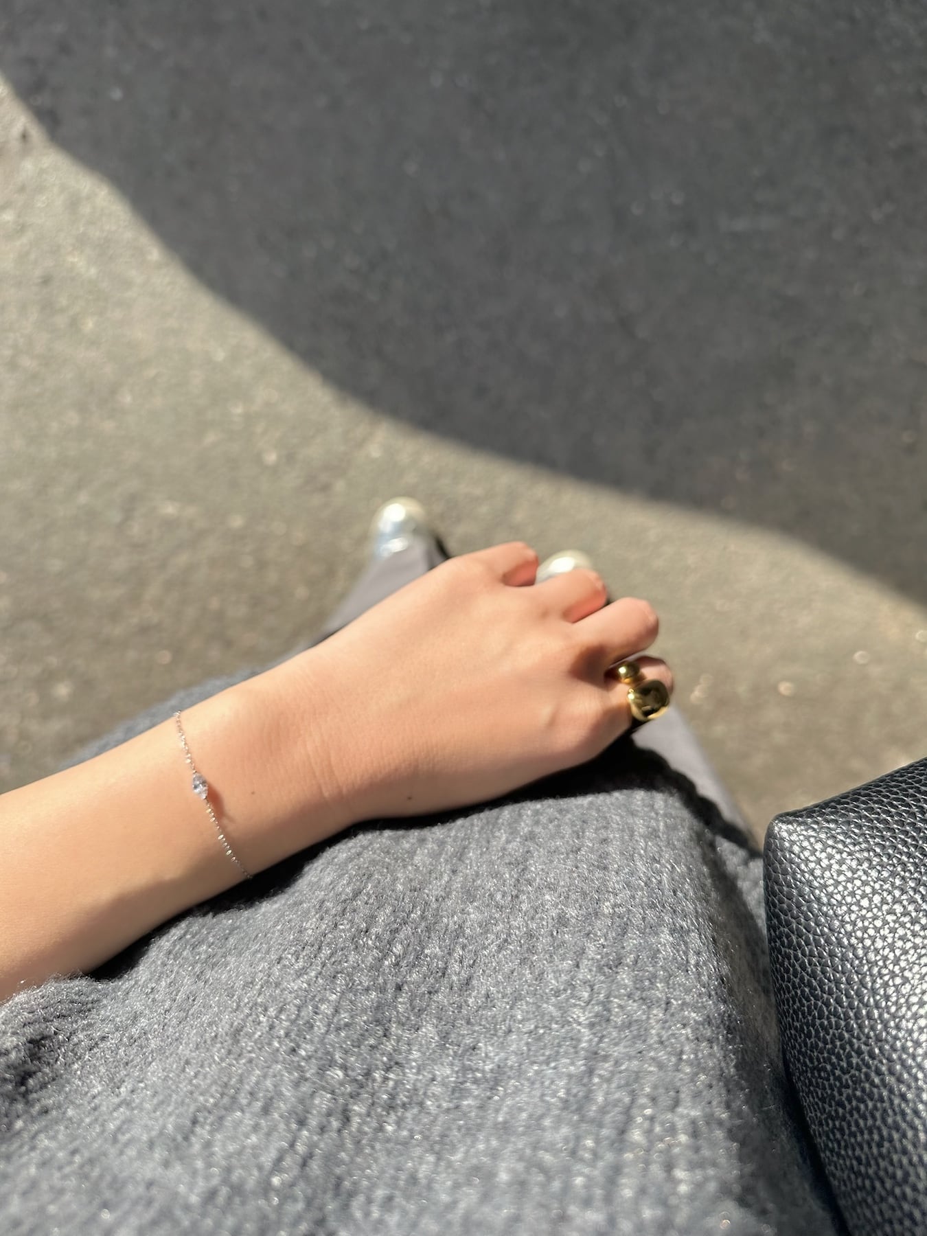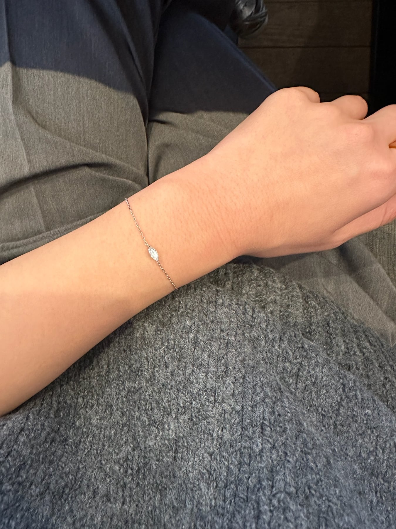 オーバルカットのストーンが、光の角度によってキラリと輝く上品なブレスレット。繊細なチェーンとミニマルなデザインで、どんなスタイルにも馴染みやすく、オフィスからお出かけシーンまで幅広く活躍します。