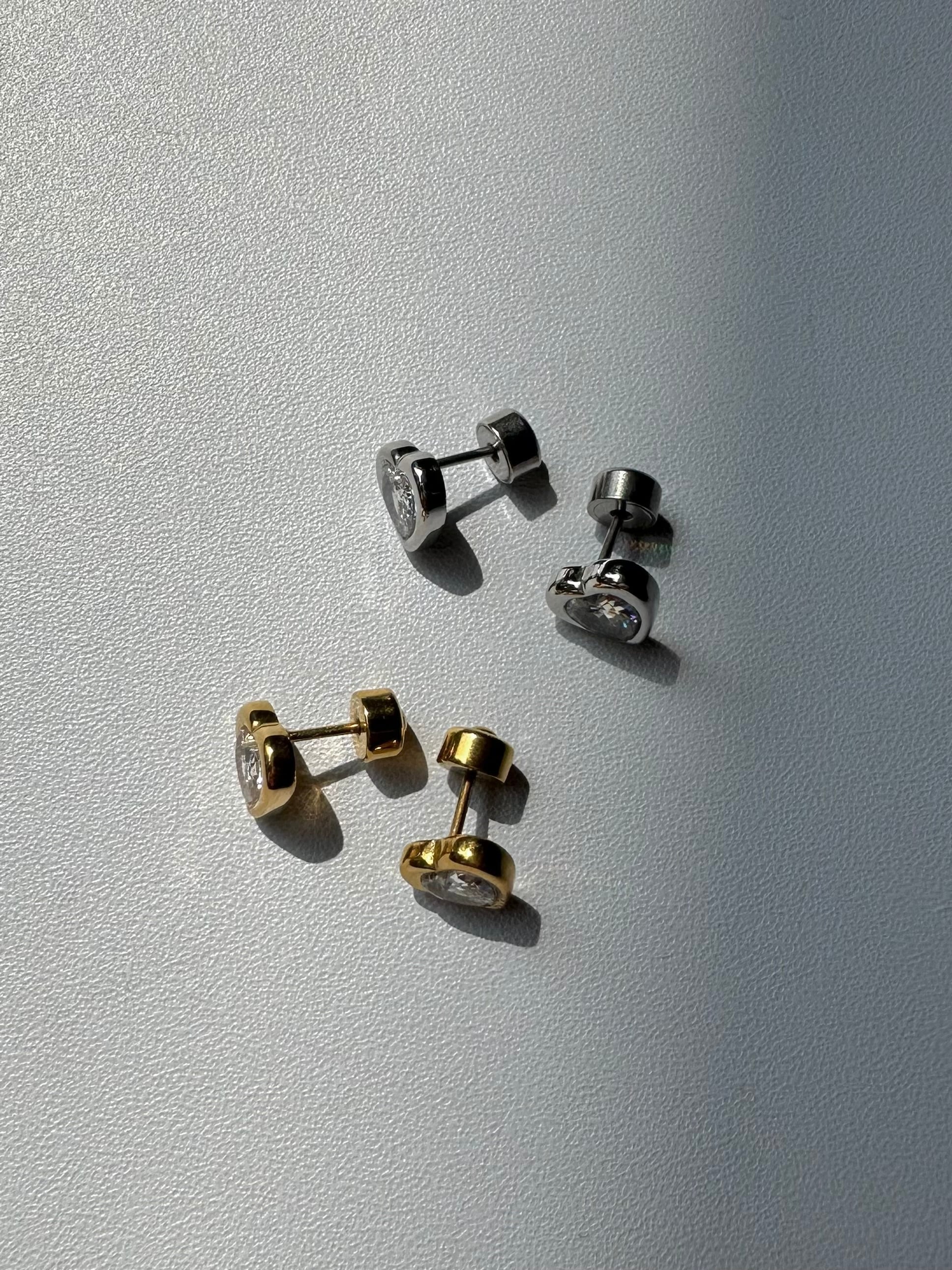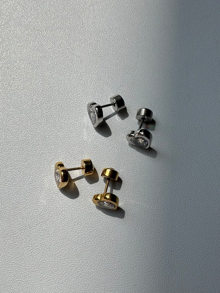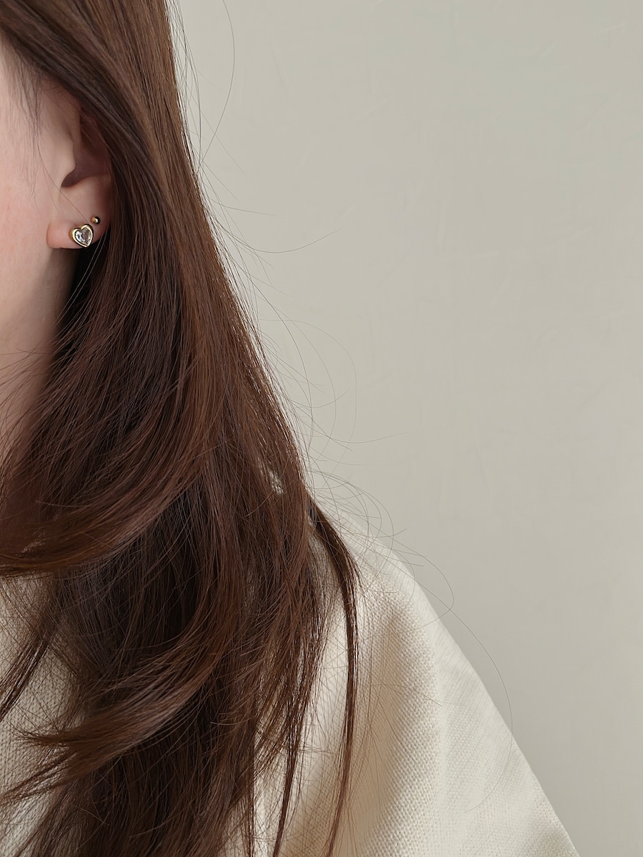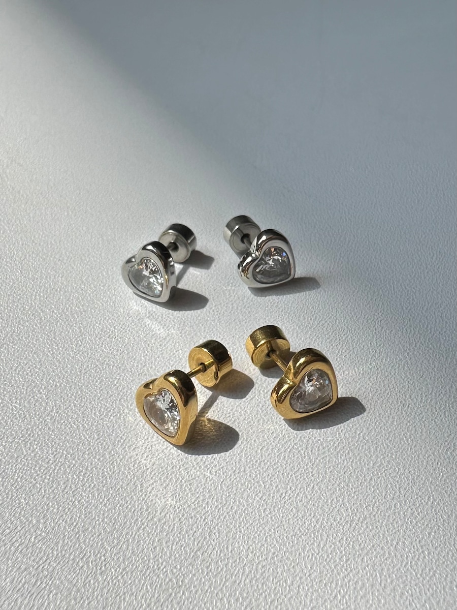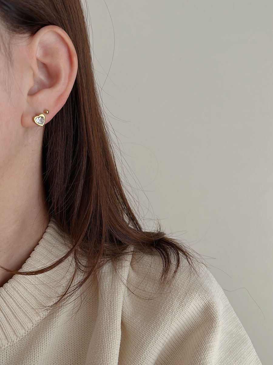 シルバー製のハート型のピアスには輝くストーンがセットされており、耳元で華やかさを演出します。