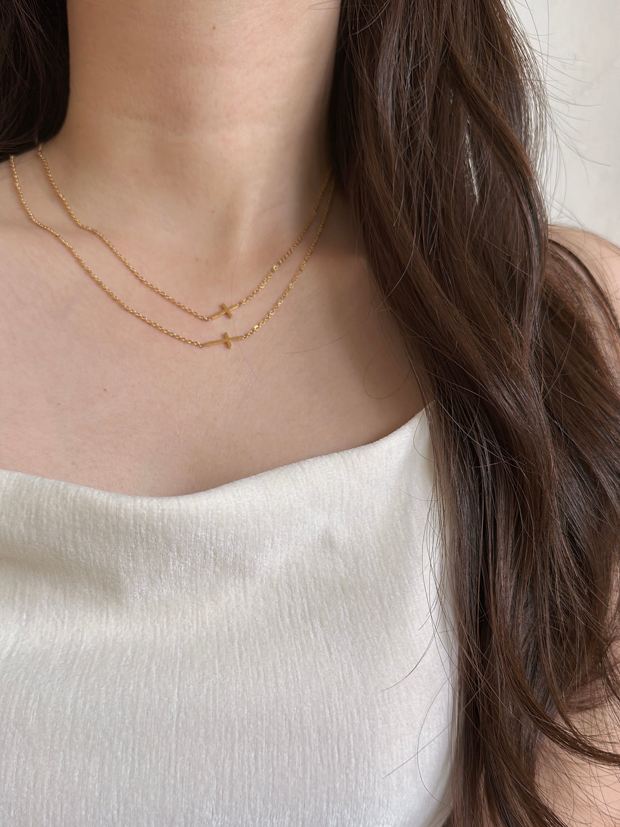 2本のチェーンにそれぞれクロスチャームがついており、重ね着け風のスタイルを楽しめます。