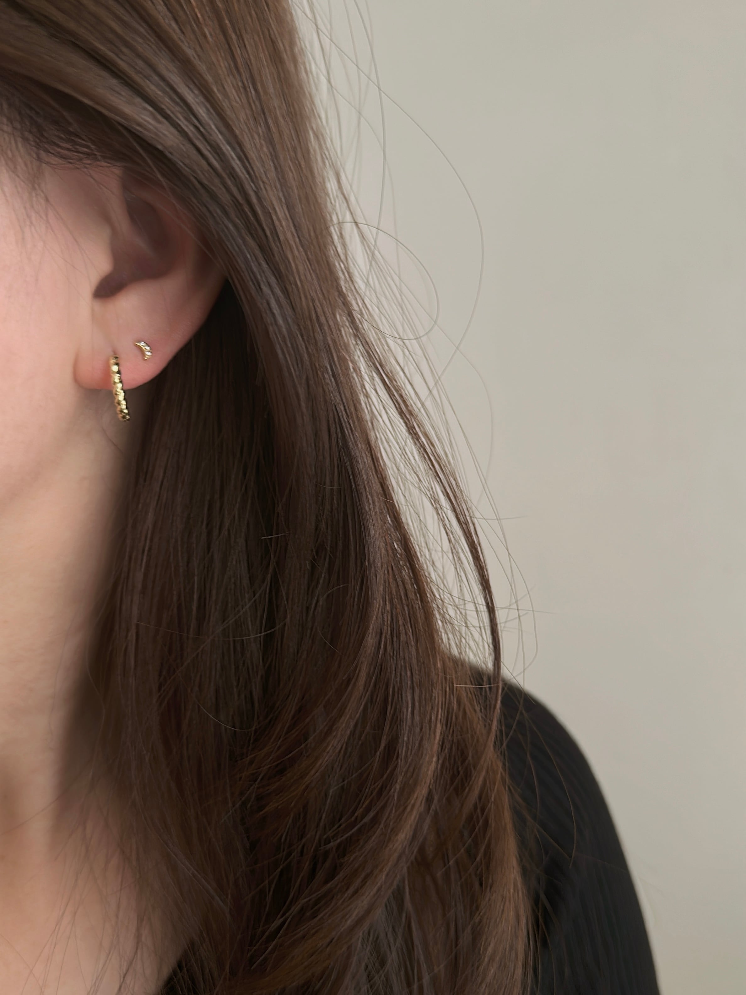 控えめなサイズながら、カーブを描くラインにセットされた小さなクリスタルが、耳元に上品な輝きを添えます。