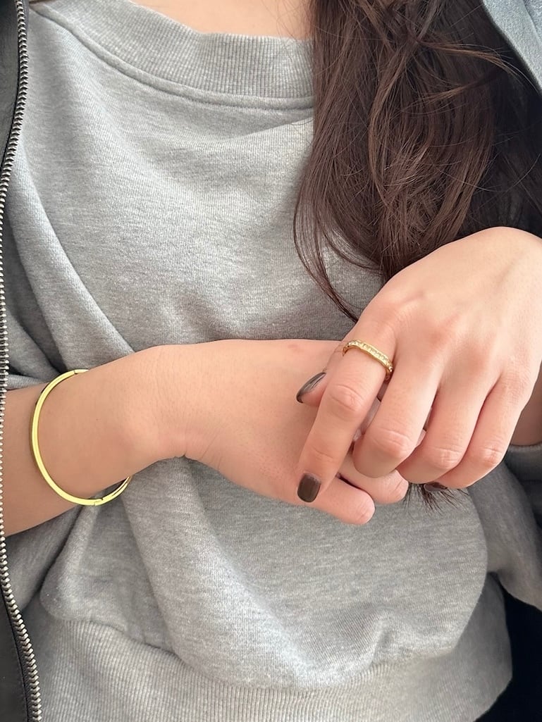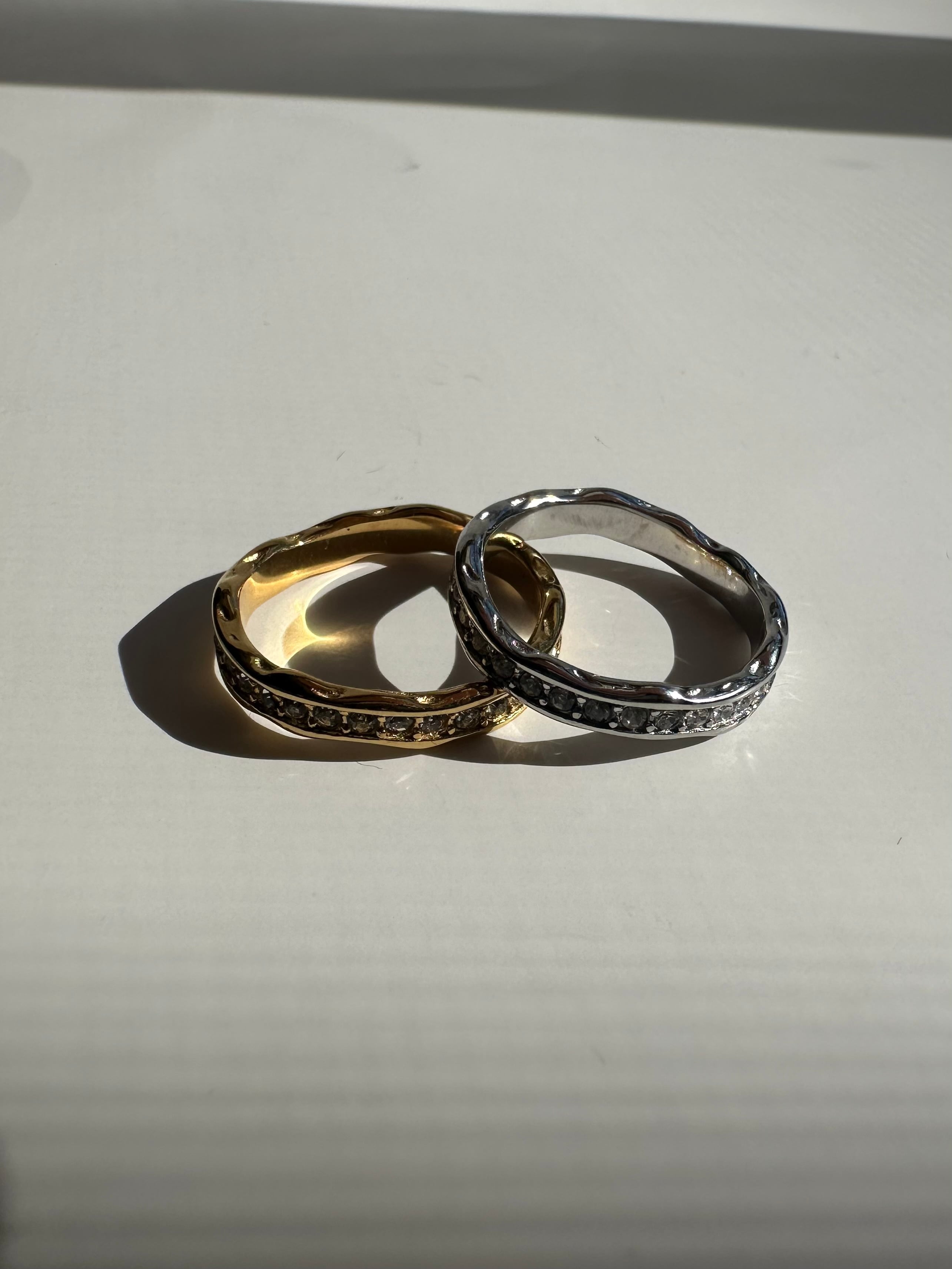 波打つような有機的なデザインが特徴で、直線的なリングとは一味違う柔らかな印象を演出。ラインストーンが繊細に輝き、光を受けるたびにエレガントな存在感を放ちます。スタッキングにも適しており、他のリングと重ね付けして個性的なコーディネートを楽しむことができます。